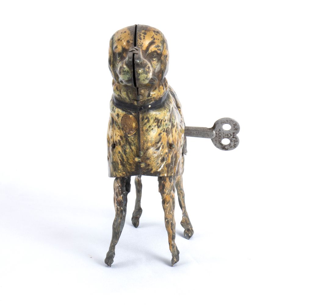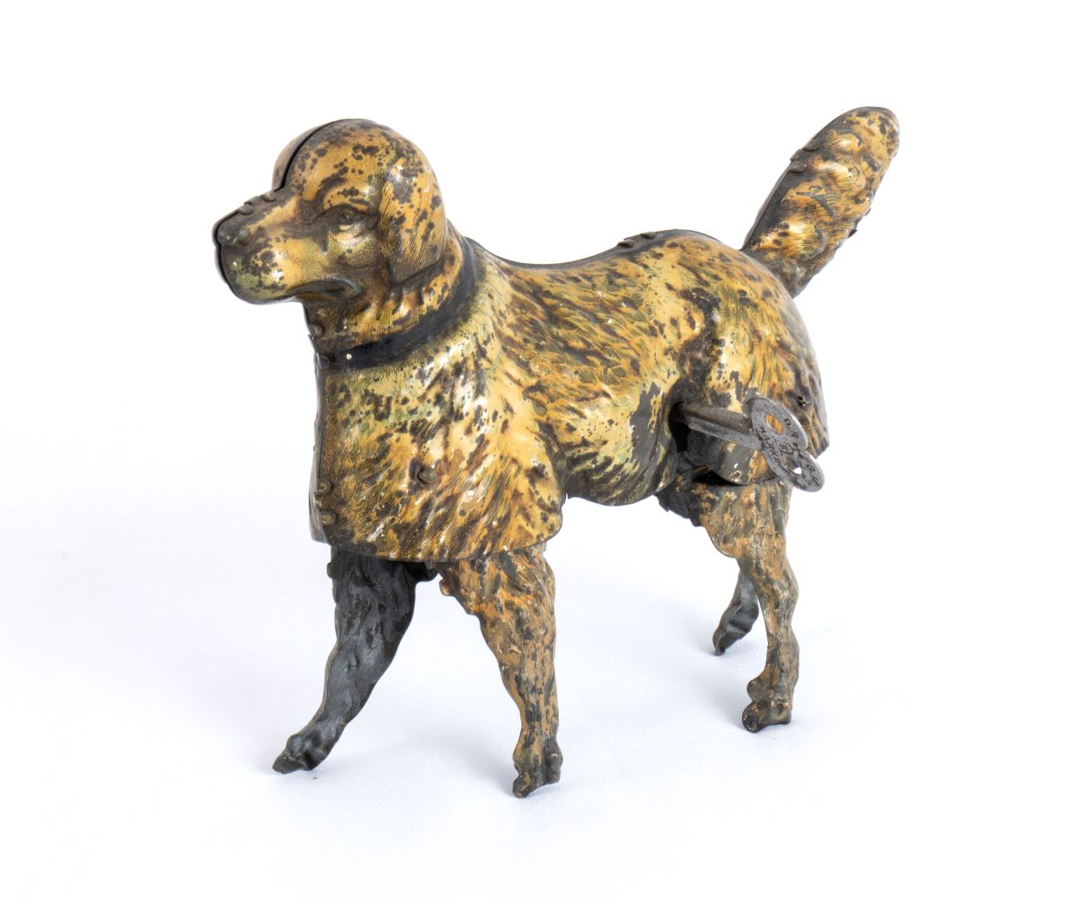 cm.30x20x20 In latta litografata, 1900-1930, cane commercializzato come "TYRAS THE WALKING DOG", carica a molla che permette al giocattolo di simulare il movimento del cane muovendo alternativamente le quattro zampe. Conllare con targhetta di riconoscimento al collo, litografato, riportante il marchio EPL LEHMANN. Chiave originale marcata LEHMANN