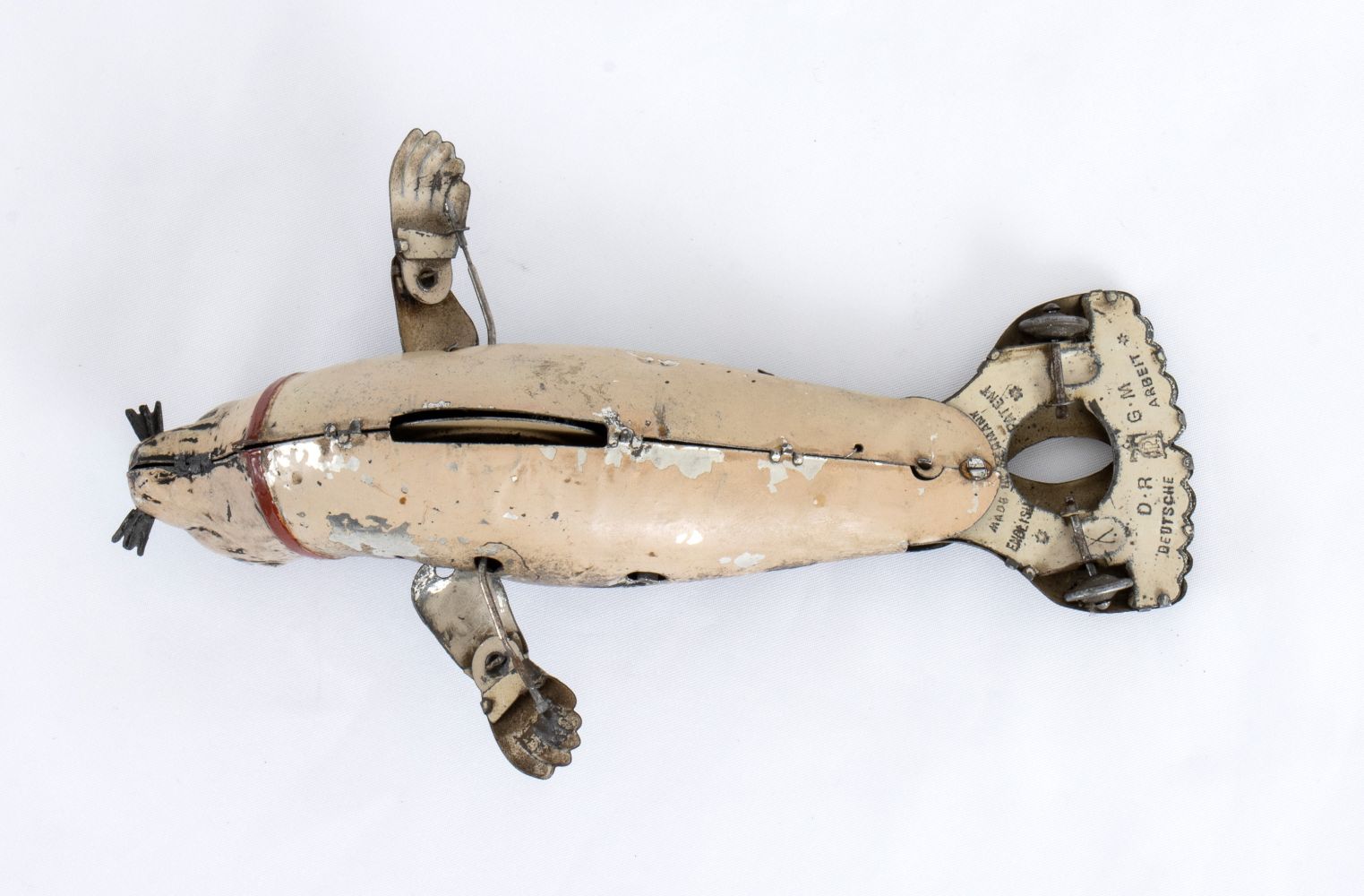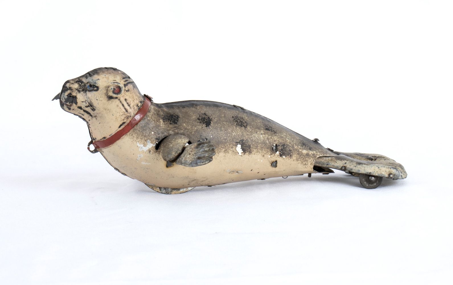 cm.30x20x20 Foca in latta litografata, 1900-1930, carica a molla, coda e pinne frontali che si muovono simulando il movimento del simpatico mammifero marino. Marcato DRGM DEUTSCH ARBEIT Made in Germany con logo EPL LEHMANN sulla coda. Nel 1900, il giocattolo fu commercializzato come "The Performing Sea Lion" e fu ispirato dalla visita di Lehmann alla Cliff House di San Francisco dove osservò le foche prendere il sole sulle rocce, secondo il libro di Cieslik, Lehmann Toys.