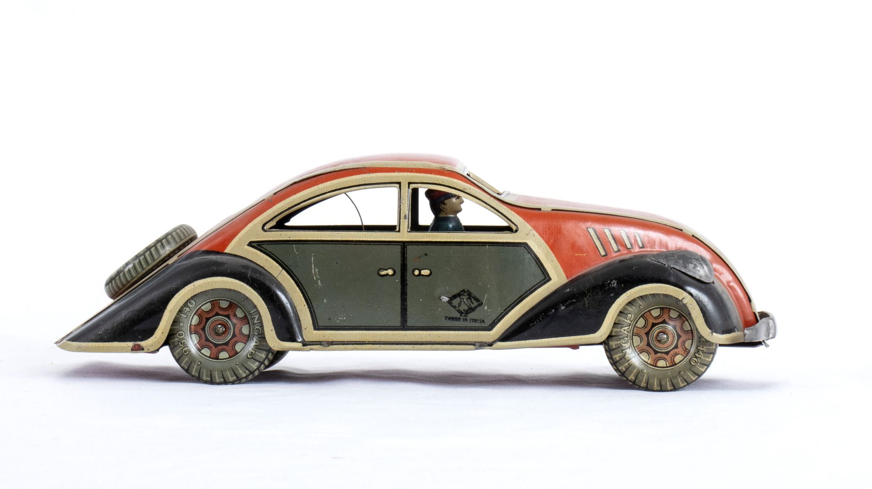 cm.30x30x20 Latta litografata, modello di auto stile decò, targata PD 1500, colore rosso, grigio e passaruote indaco. Con pilota originale, ruota di scorta, paraurti. Ruote litografate marcate INGAP 950x140. Meccanismo di carica a molla. Giocattolo anni '930, marcato INGAP