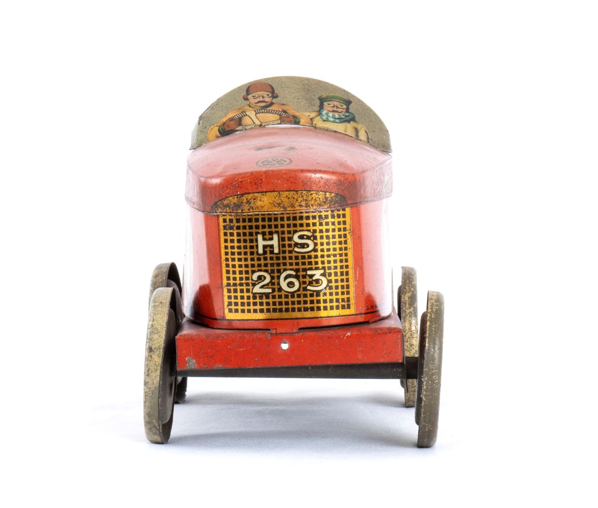 cm.30x20x20 Scatola in latta contenitore per caramelle o biscotti, a forma di auto da corsa. Latta litografata, con dettagli del pilota e copilota della vettura, numero 1 di gara.. Targa HS 263. Made in Italy, marcata G.DE ANDREIS. Anni 1920-1925