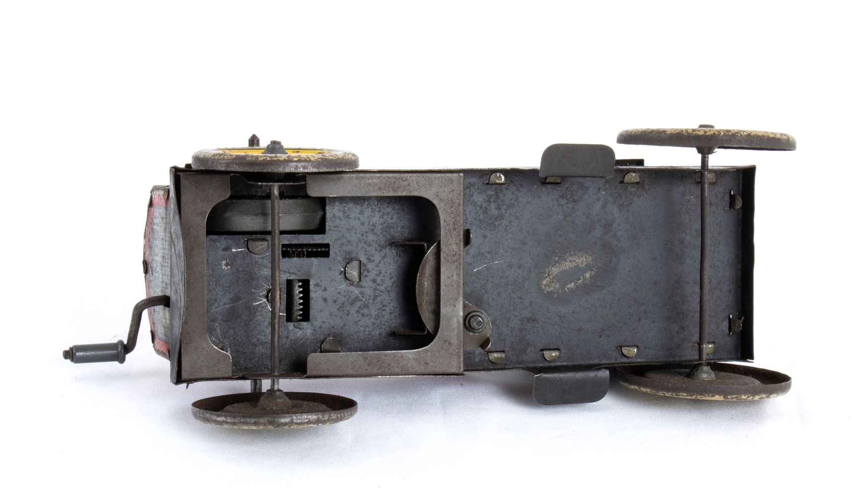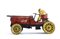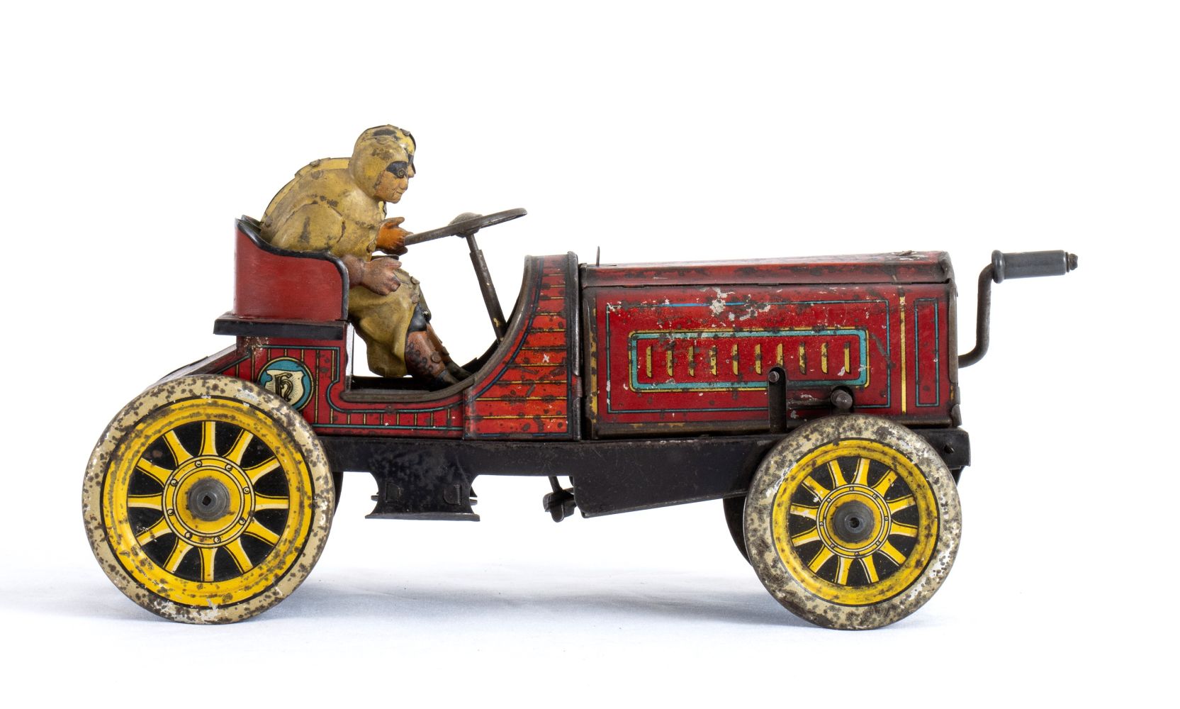 cm.30x20x20 Auto da corsa tipo Gordon Bennet, con due personaggi pilota e copilota, ispirata dalla . Latta litografata, con movimento meccanico a volano, azionato dalla manovella frontale installata sul radiatore. Cofano motore apribile. Made in Germany, 1910.