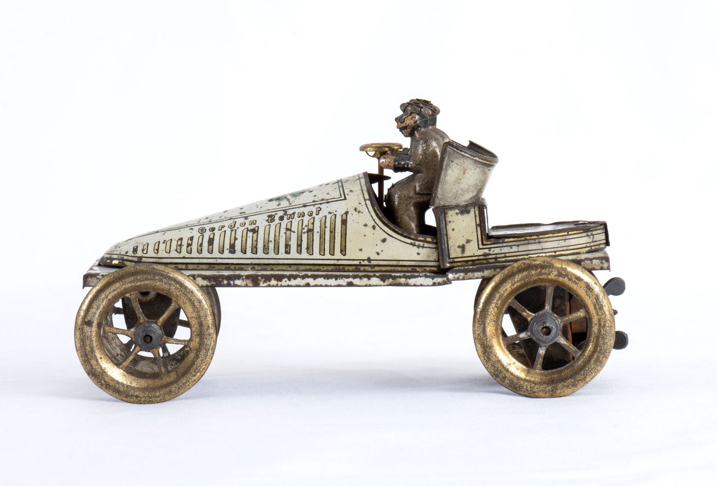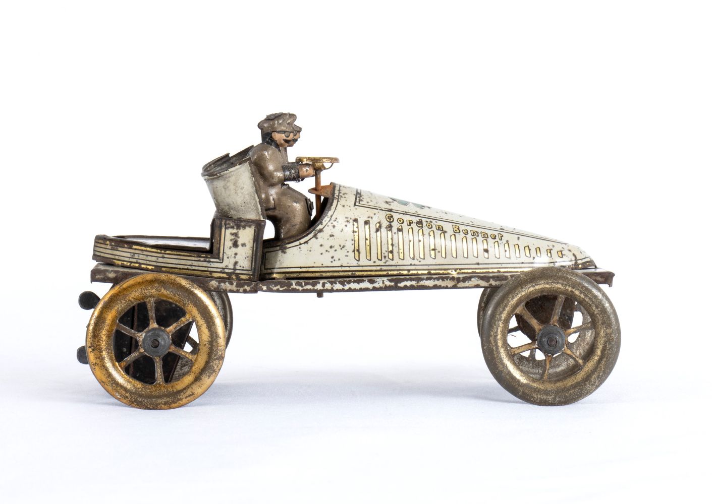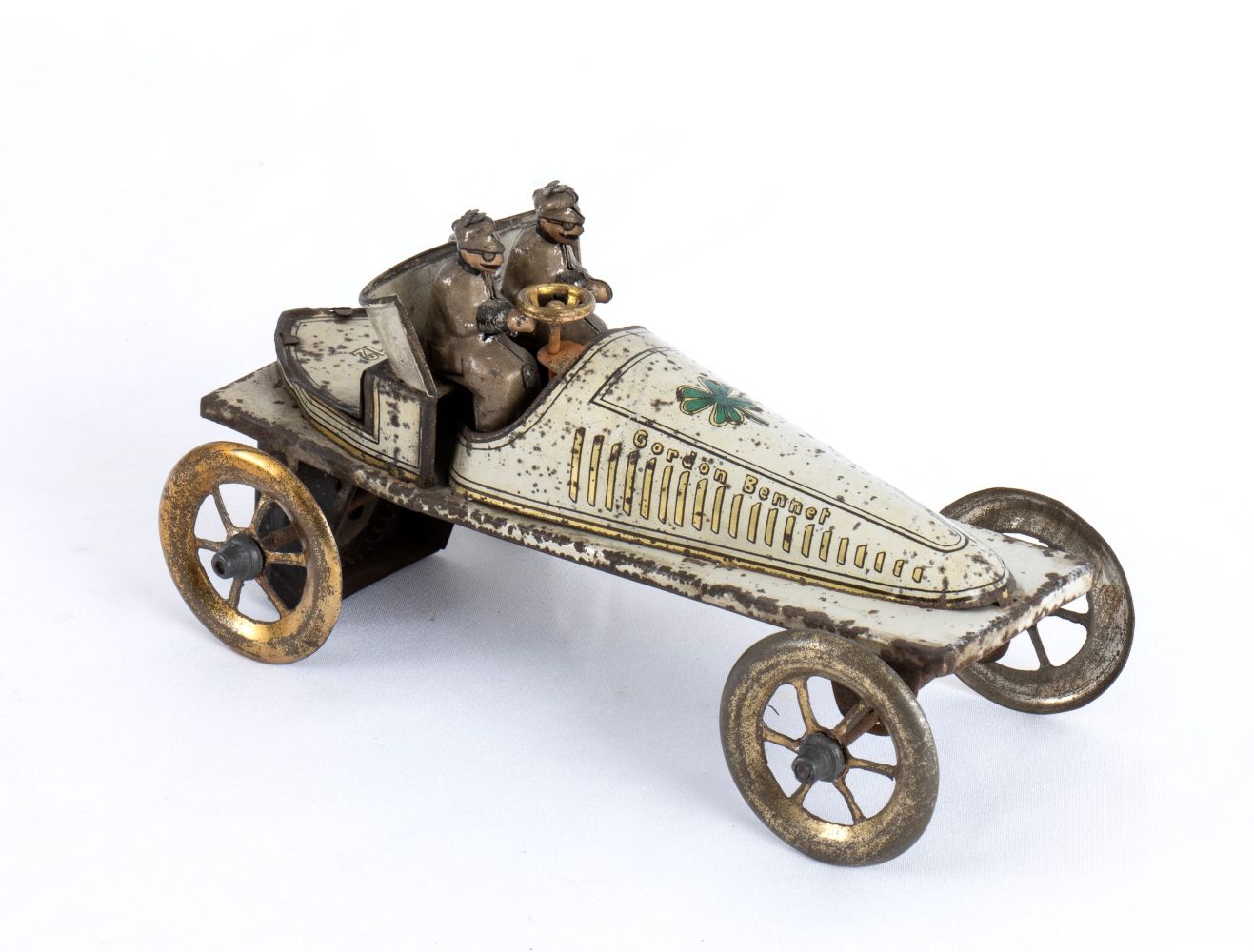 cm.30x30x20 Meravigliosa e rara auto da corsa GORDON BENNET , con numero di gara 12, quadrifoglio litografato sul cofano motore, dicitura GORDON BENNET ai lati della carrozzeria. In latta litografata bianca con dettagli in oro, ruote sterzanti, con pilota e co-pilota originali, meccanismo di carica a molla fisso. Made in Germany, non marcata, ISSAMYER (o prababile FISHER ?) Anno 1910-1912