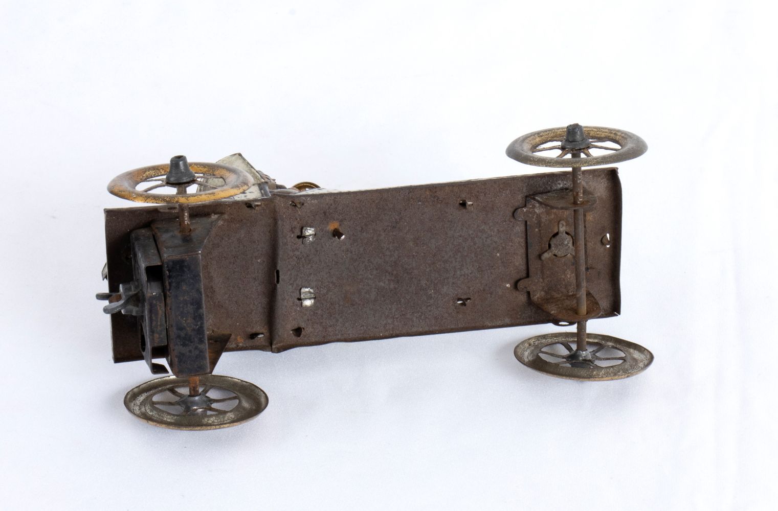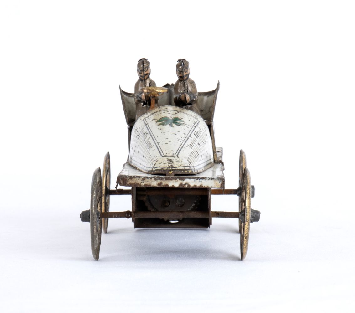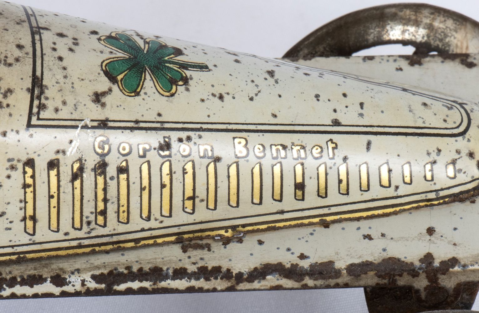 cm.30x30x20 Meravigliosa e rara auto da corsa GORDON BENNET , con numero di gara 12, quadrifoglio litografato sul cofano motore, dicitura GORDON BENNET ai lati della carrozzeria. In latta litografata bianca con dettagli in oro, ruote sterzanti, con pilota e co-pilota originali, meccanismo di carica a molla fisso. Made in Germany, non marcata, ISSAMYER (o prababile FISHER ?) Anno 1910-1912
