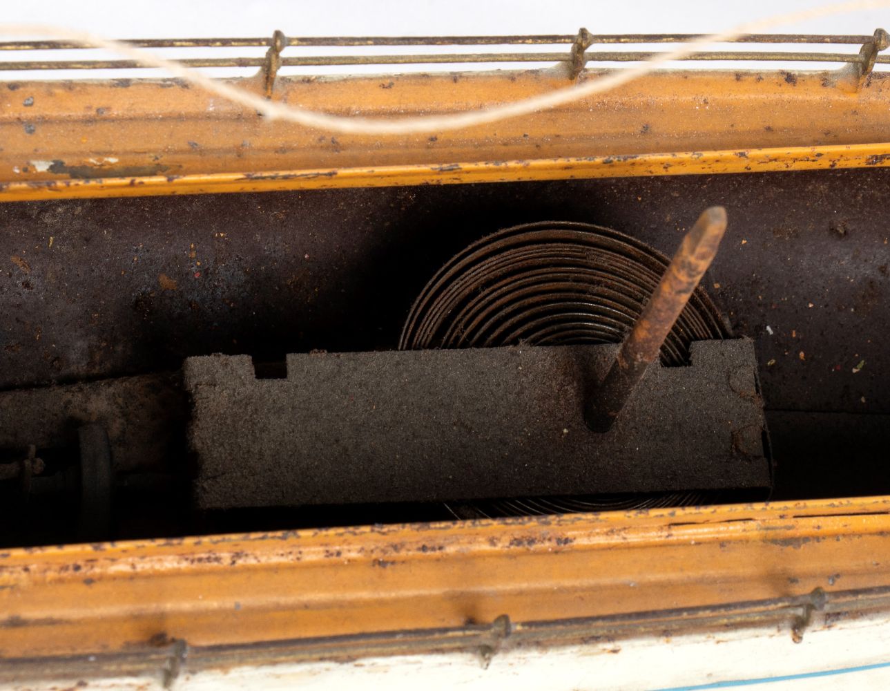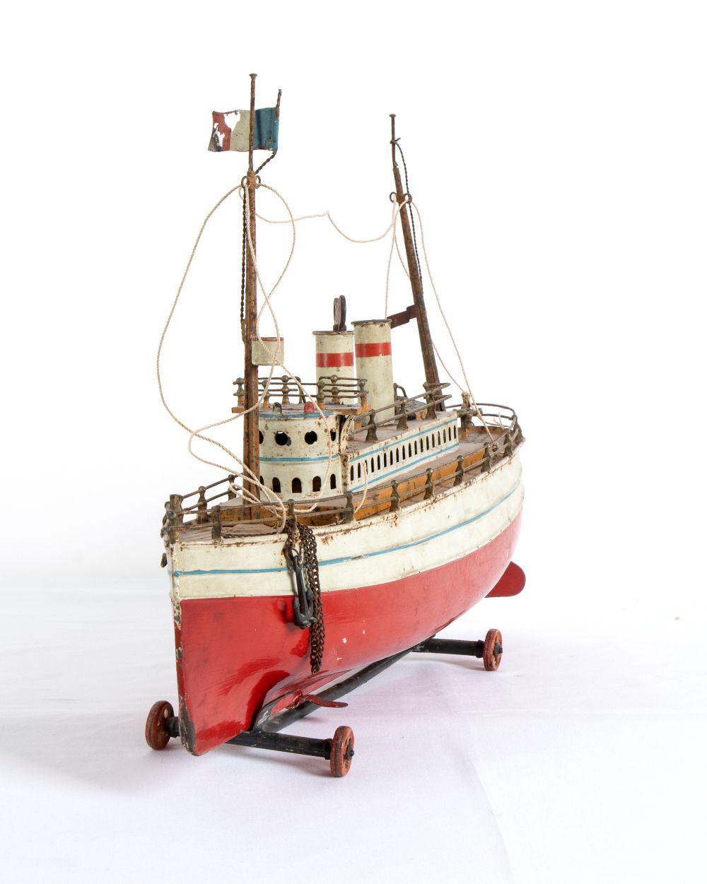 Latta 35x30 Carette George, nave passeggeri in latta litografata e dipinta, due fumaioli, due alberi, sovrastruttura rimovibile per accedere al motore a molla. Meccanismo di carica funzionante. In condizioni originali, vernice originale, carrello con quattro ruote in metallo originale, in buone condizioni