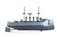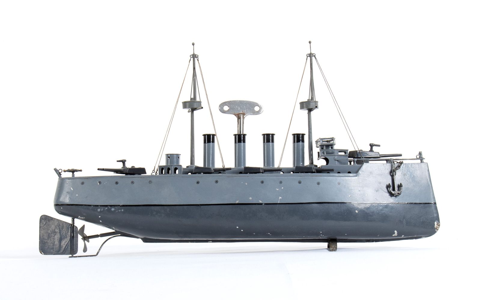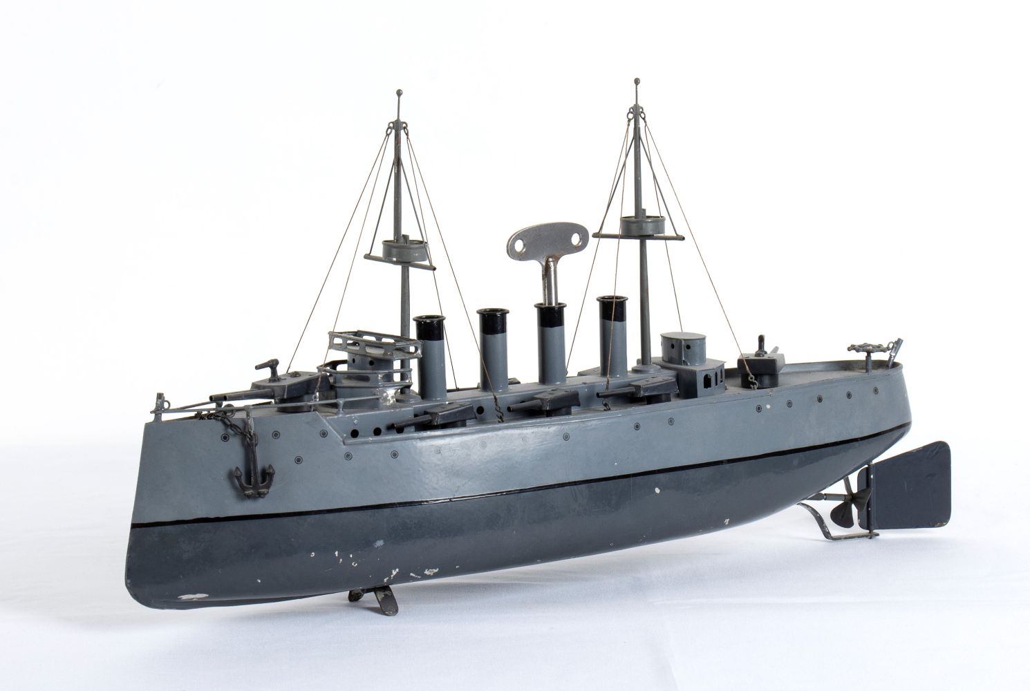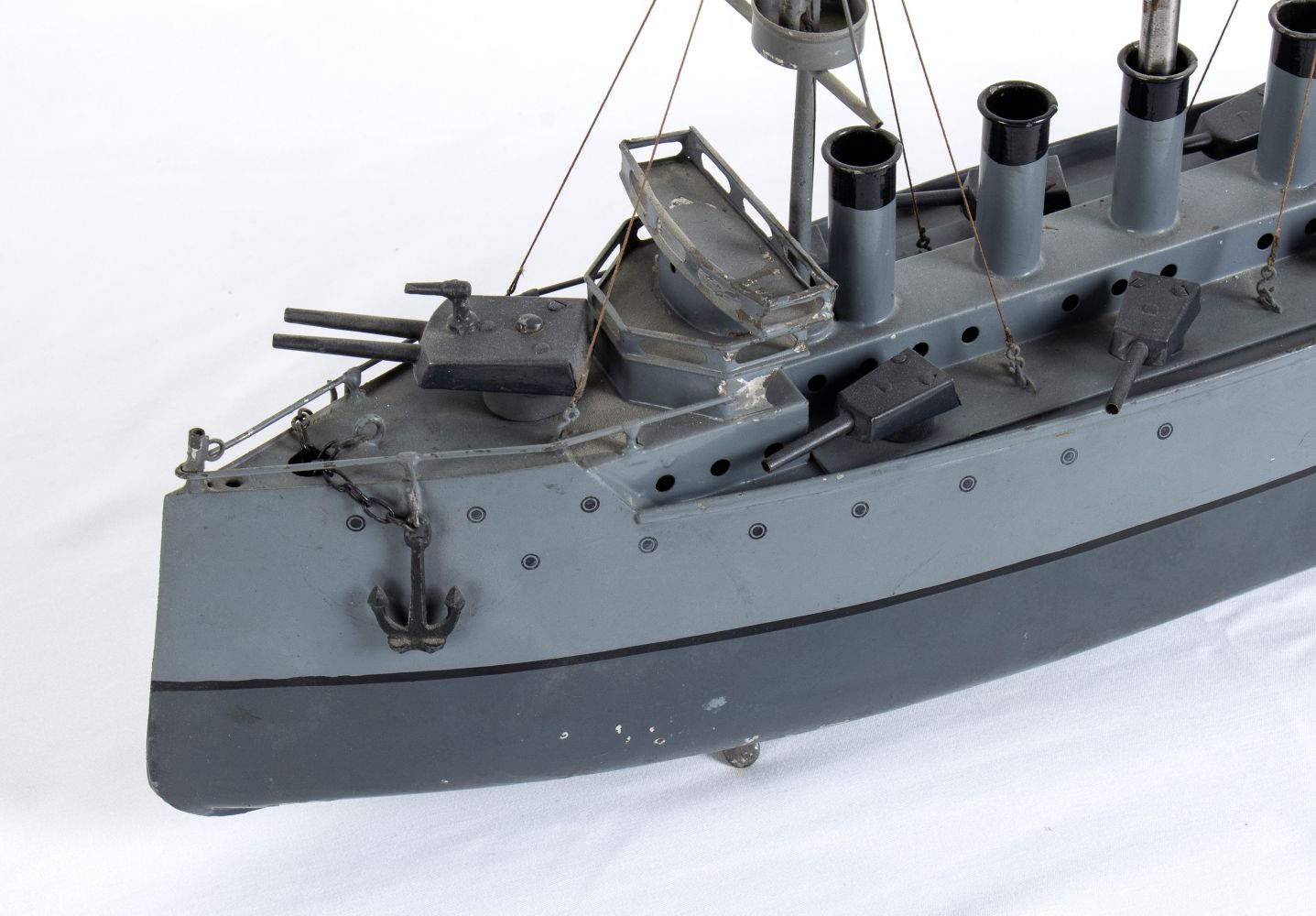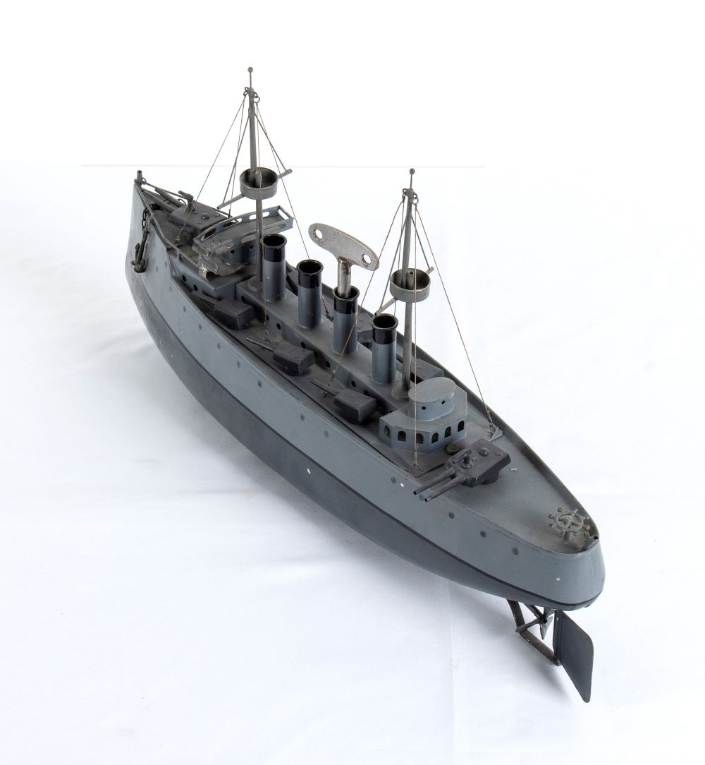 Latta cm.35 Incrociatore da guerra, in latta, BING Gebruder Bing Nuremberg, Germany. Sovrastruttura con 4 fumaioli, 3 batterie di cannoni doppi per fiancata, una batteria a poppa ed una a prua, due alberi con torrette di avvistamento, due ancore a prua. Timone di navigazione orientabile, meccanismo di carica a molla funzionante. Lievi restauri, in eccellente stato di conservazione