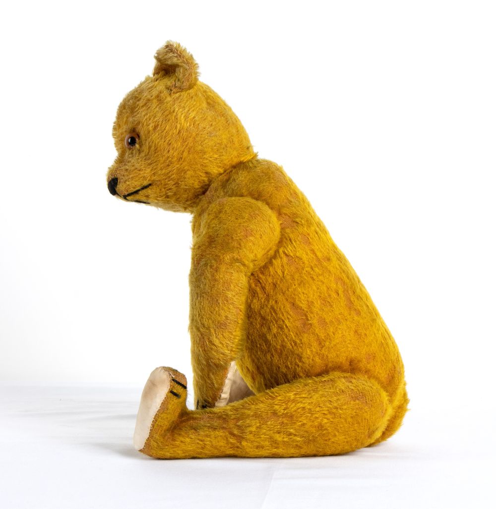 cm.38 Orso probabilmente BING, prodotto in Germania negli anni '20s , snodato in 5 parti, mohair biondo, occhi in vetro, 4 artigli per zampa con cuscinetti in feltro originali, naso e bocca cuciti in filo nero, verso (growler) interno. Imbottito in paglia, leggera mancanza interna alla zampa superiore sinistra, pelliccia in mohair con lievi mancanze sparse, ma in generali buone condizioni