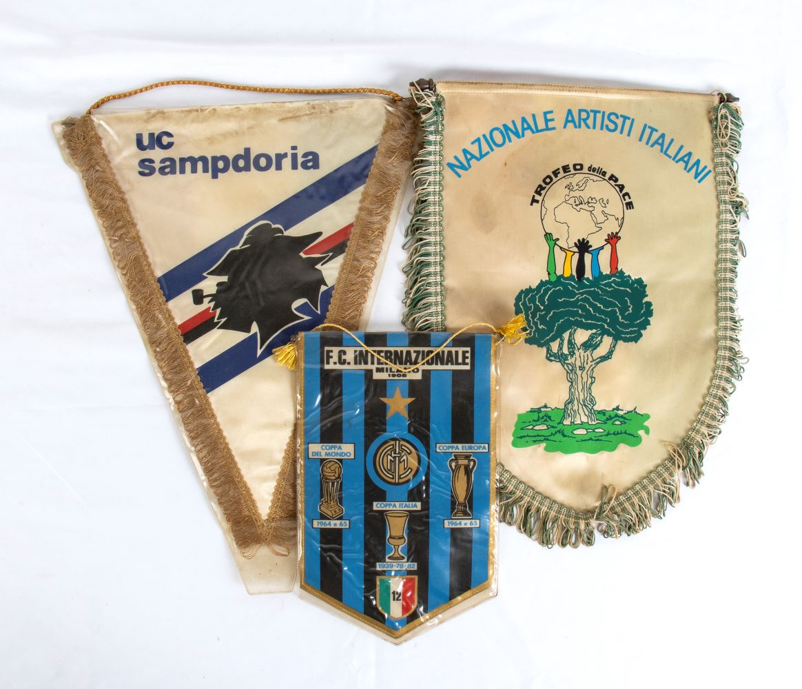 Lotto di tre gagliardetti anni '70-'80, in materiale sintetico, stampati, della NAZIONALE ARTISTI ITALIANI per il TROFEO DELLA PACE (marcato Marango Sport Roma), della UC SAMPDORIA e della FC INTERNAZIONALE di Milano 1908 (all'epoca con 12 scudetti). Misure varie, cm.25 fino a cm.45, due con confezione originale