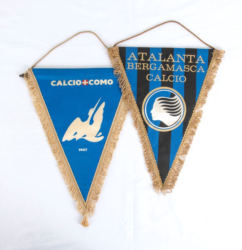 sintetico cm.35 Lotto di due gagliardetti del CALCIO COMO 1907 (marcato AI.MA Torino MITA) ed ATALANTA BERGAMASCA CALCIO, in sintetico stampato, con aste in metallo e cordoncini. Buone condizioni