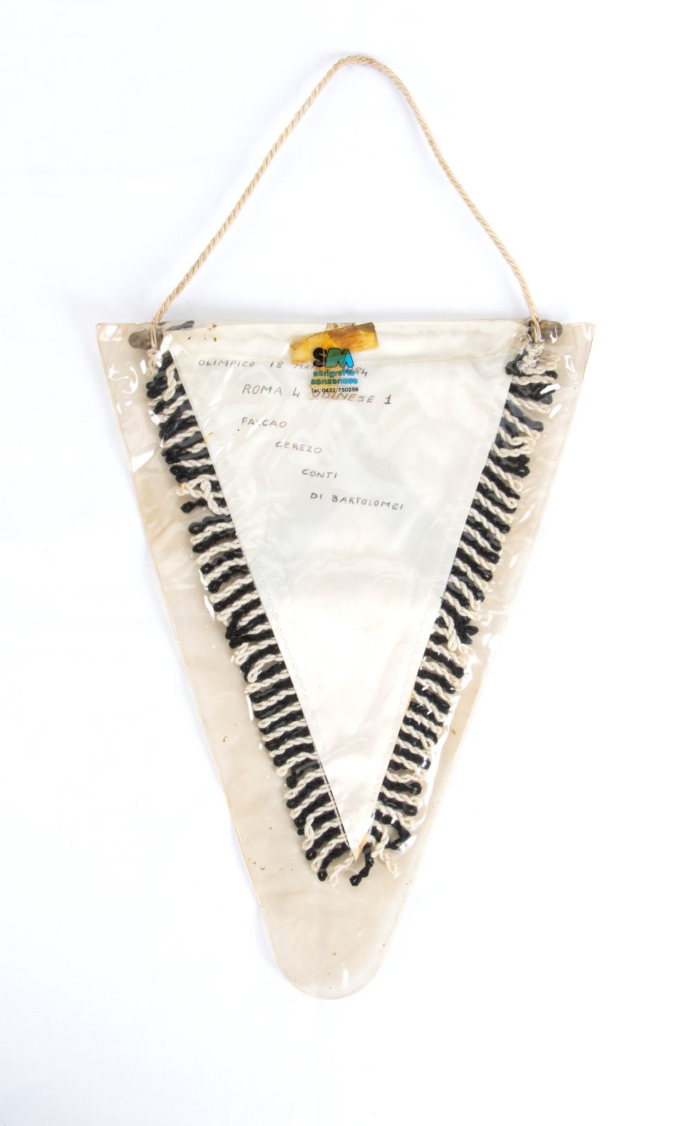 sintetico cm.30 Gagliardetto per UDINESE Calcio anno 1984, in materiale sintetico stampato, con frangia applicata, note al retro scritte a penna incontro di calcio Roma-Udinese del 18 Marzo 1984. In confezione originale. Buone condizioni