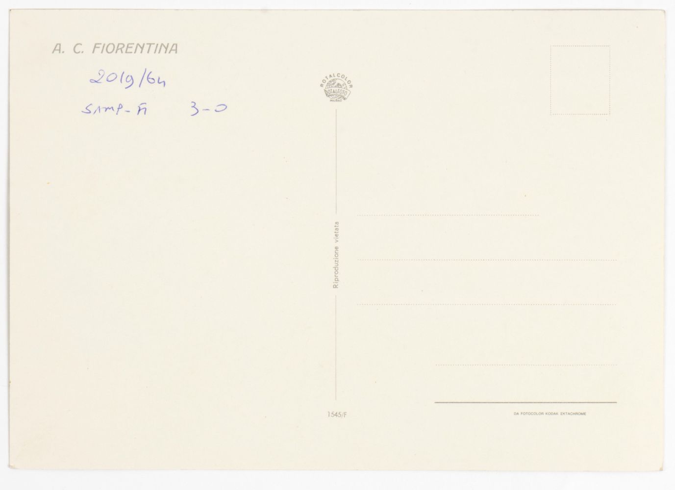 fotografia cm.21x15 Fotografia di squadra schierata della FIORENTINA con autografi. Foto cartolina a colori, ufficiale della squadra, presa all'interno dello stadio Marassi in occasione dell'incontro Sampdoria-Fiorentina del 20 Settembre 1964. Autografi originali, scritti di pugno dai calciatori viola tra i quali si riconoscono Albertosi, Pirovano, Guarnacci, Marchesi, Enzo Robotti, Kurt Hamrin. Fotografia della collezione personale del mister Rino Marchesi