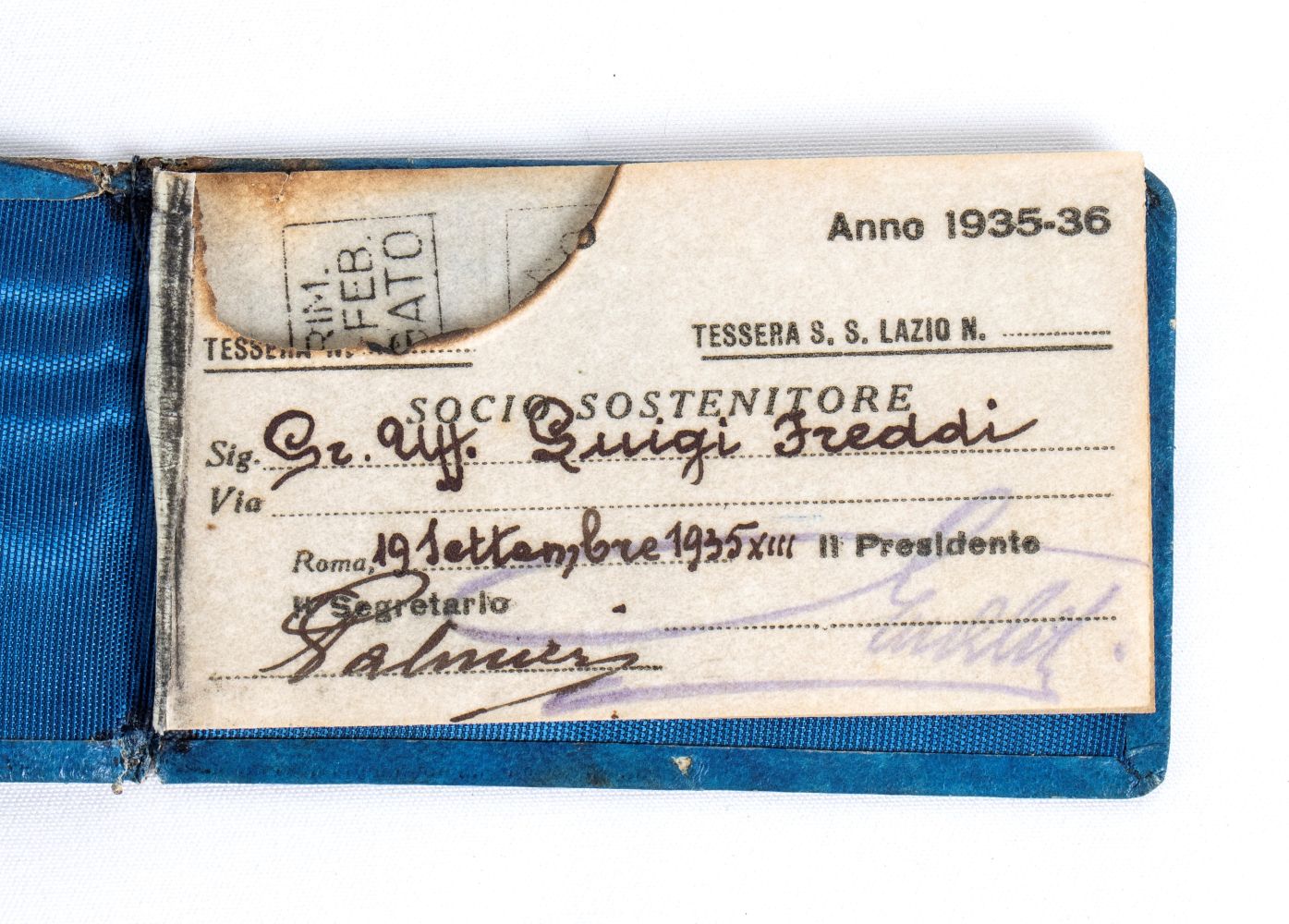 carta Tessera rilasciata dalla SS LAZIO per la stagione 1935-36 nominativa per Luigi Freddi - Valida per l'accesso allo stadio, con copertina in similpelle azzurra, stemma a scudo della SS LAZIO stampato, firmata dal segretario e dal presidente (Erberto Vaselli ?). Danni alla prima di copertina ed una pagina - Luigi Freddi (Milano, 12 giugno 1895 – Sabaudia, 17 marzo 1977) è stato un giornalista e politico italiano, noto soprattutto per essere stato prima vicesegretario dei fasci italiani all'estero, e successivamente uno dei massimi responsabili della politica cinematografica italiana nella seconda metà degli anni trenta e all'inizio degli anni quaranta del novecento. È stato l'ideatore di Cinecittà.