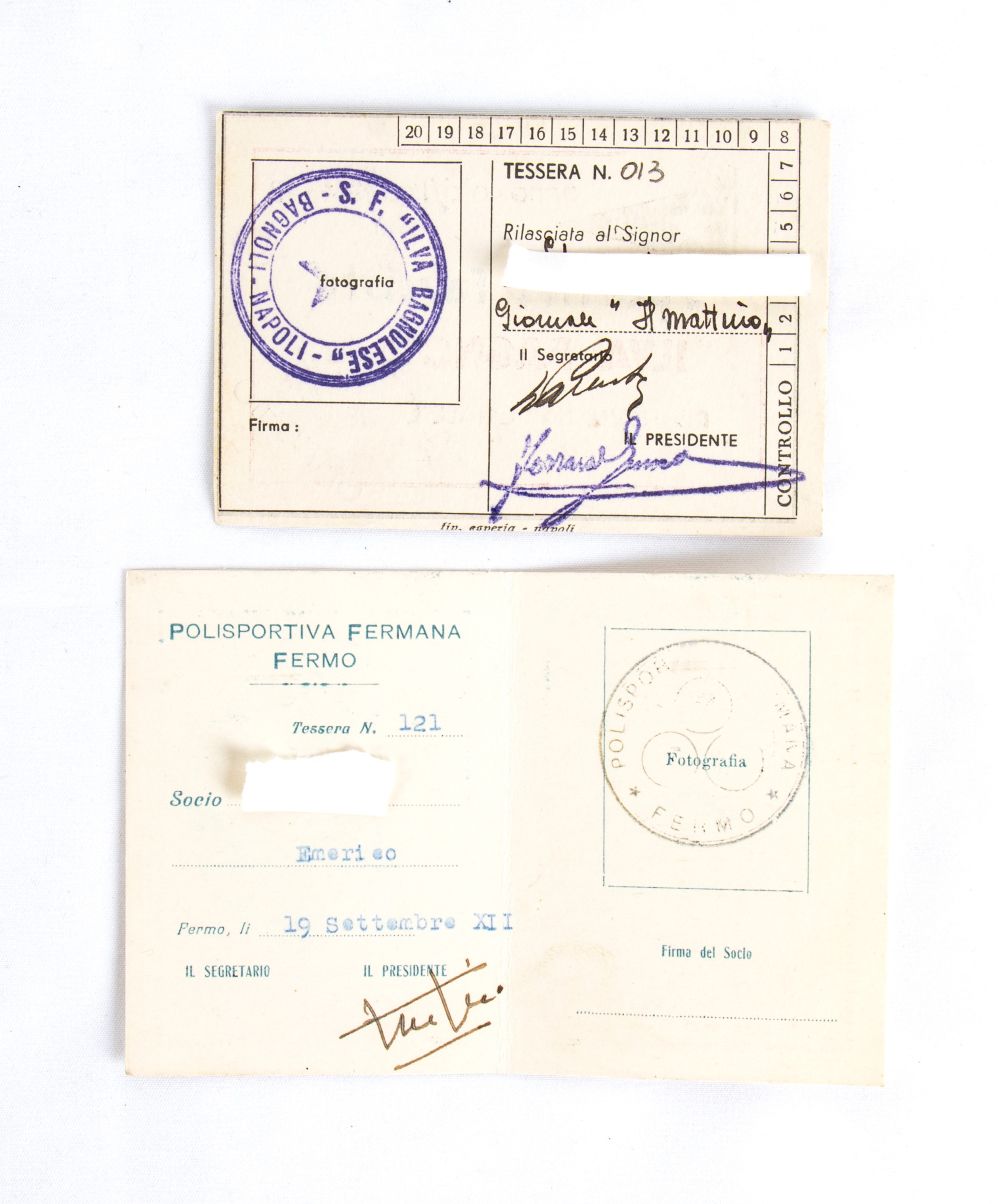 carta Lotto composto da tessera della SPORTIVA FASCISTA "ILVA BAGNOLESE" divisione nazionale C per l'anno 1941-42 compilata e timbrata, e tessera della POLISPORTIVA FERMANA per l'anno 1934 compilata