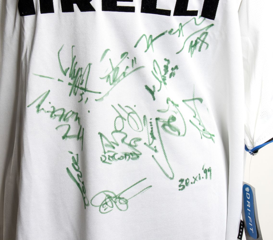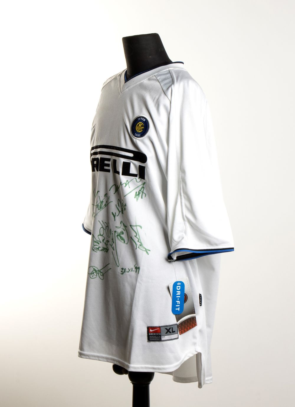 jersey Maglia bianca a maniche corte INTER 1908 con patch tonda a sinistra senza stella, sponsor PIRELLI applicato in vellutino, con cartellino da store, con autografi originali scritti di pugno con pennarello verde dai calciatori (si riconoscono Recoba, Zamorano ed altri) e la data 30.XI.'99 - in ottimo stato