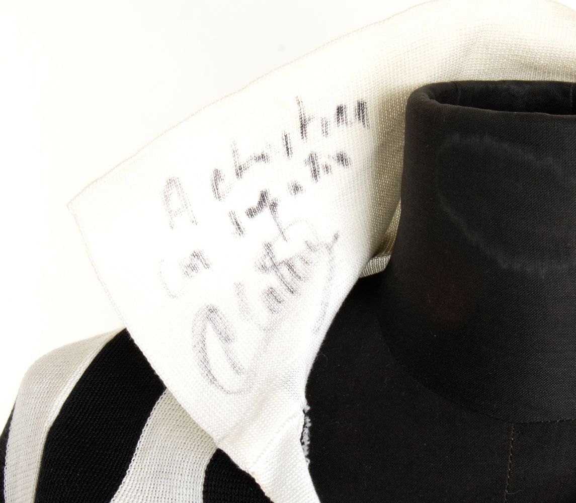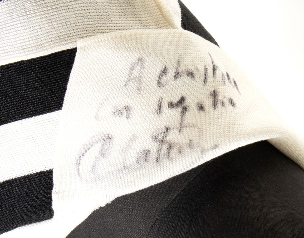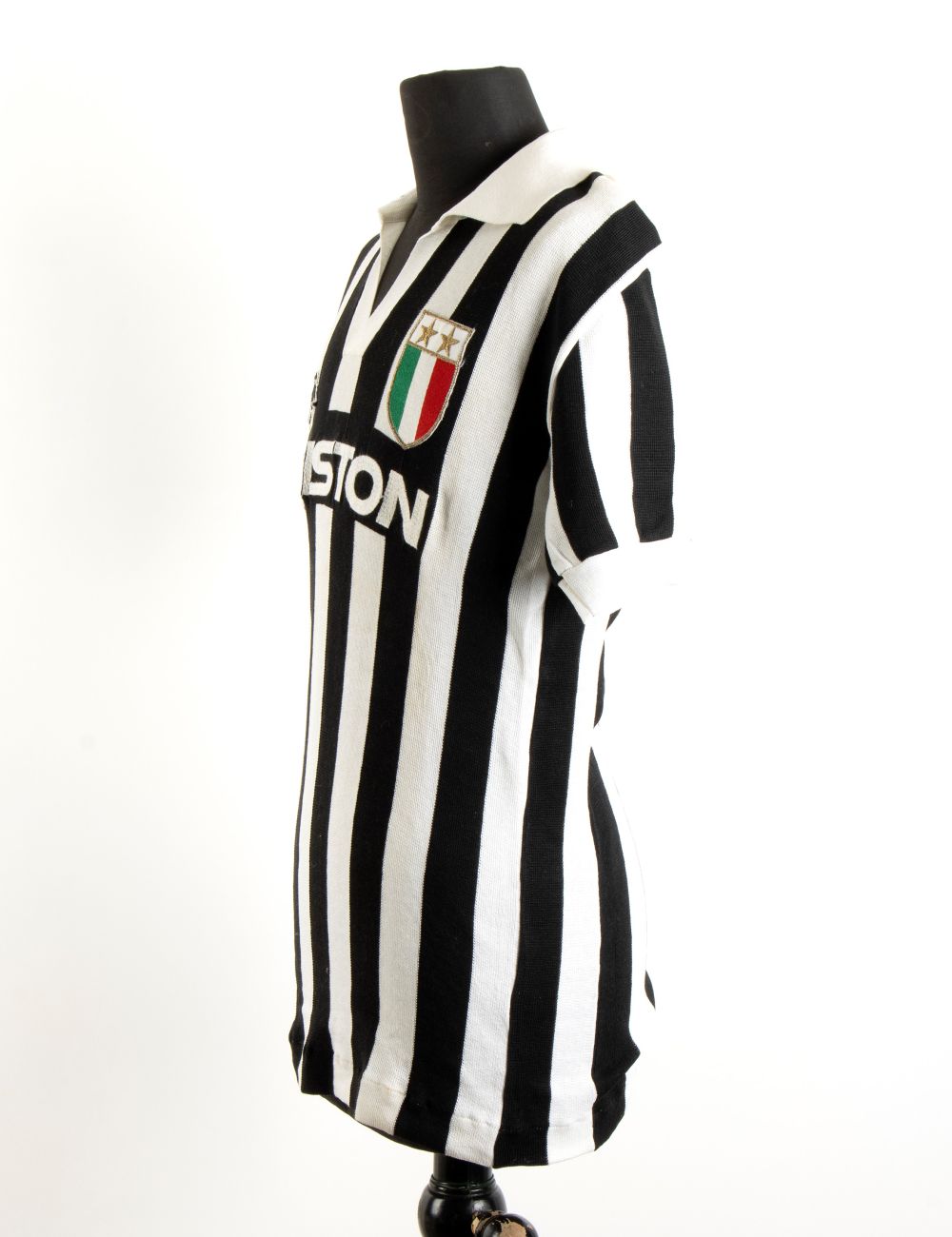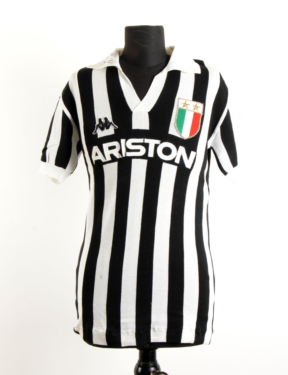 Maglia di calcio della Juventus, numero 10, indossata da Michel Platini in una partita di campionato di Serie A, nella stagione 1986-87, con dedica e firma autografe apposte sul colletto della maglia. Maglia in cotone, scollo a V con maniche corte, sponsor ARISTON ricamato al petto, scudetto tricolore con due stelle cucito a sinistra, marchio Robe di Kappa a destra, numero 10 con cifre in cotone cucite sul dorso. In ottime condizioni. La maglia è certificata dal "mister" Rino Marchesi allenatore della Juventus nelle stagioni 1986-88 e proviene dalla sua collezione personale, e la dedica è indirizzata alla figlia Cristina
