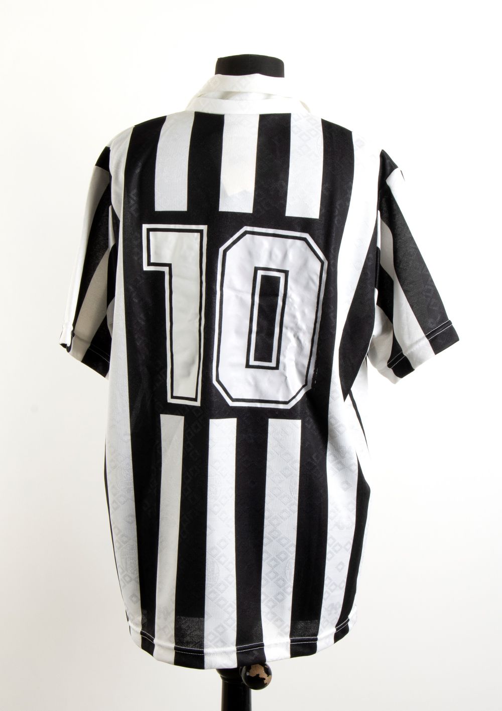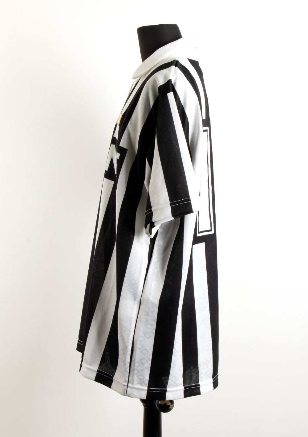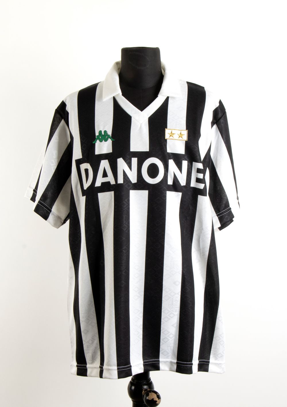 Cotone Maglia di calcio della Juventus , anni 1992-93, numero 10 per Roberto Baggio. Maglia maniche corte, in jersey, scollo a V, sponsor DANONE stampato al petto, patch con due stelle cucita a sinistra, marchio Robe di Kappa ricamato in verde a destra, numero 10 stampato sul dorso. In perfette condizioni, con targhette originali. La maglia proviene dalla collezione personale dal "mister" Rino Marchesi allenatore della Juventus nelle stagioni 1986-88