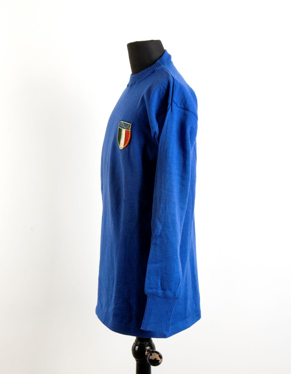 Cotone Maglia della nazionale italiana del 1961-62 appartenuta a Rino Marchesi e giocata nella partita amichevole Italia- Argentina del 15/6/1961 terminata con il risultato di 4 a 1 dove Marchesi entrava in sostituzione di Lojacono. Maglia in lanetta azzurra, maniche lunghe, scudetto in feltro e cotone applicato, numero 15 in feltro cucito, etichette ROMA e taglia 5 al collo interno, firma autografa di Rino Marchesi a pennarello nero. Ottime condizioni. Disponibile certificato di autentica firmato dal Mister stesso