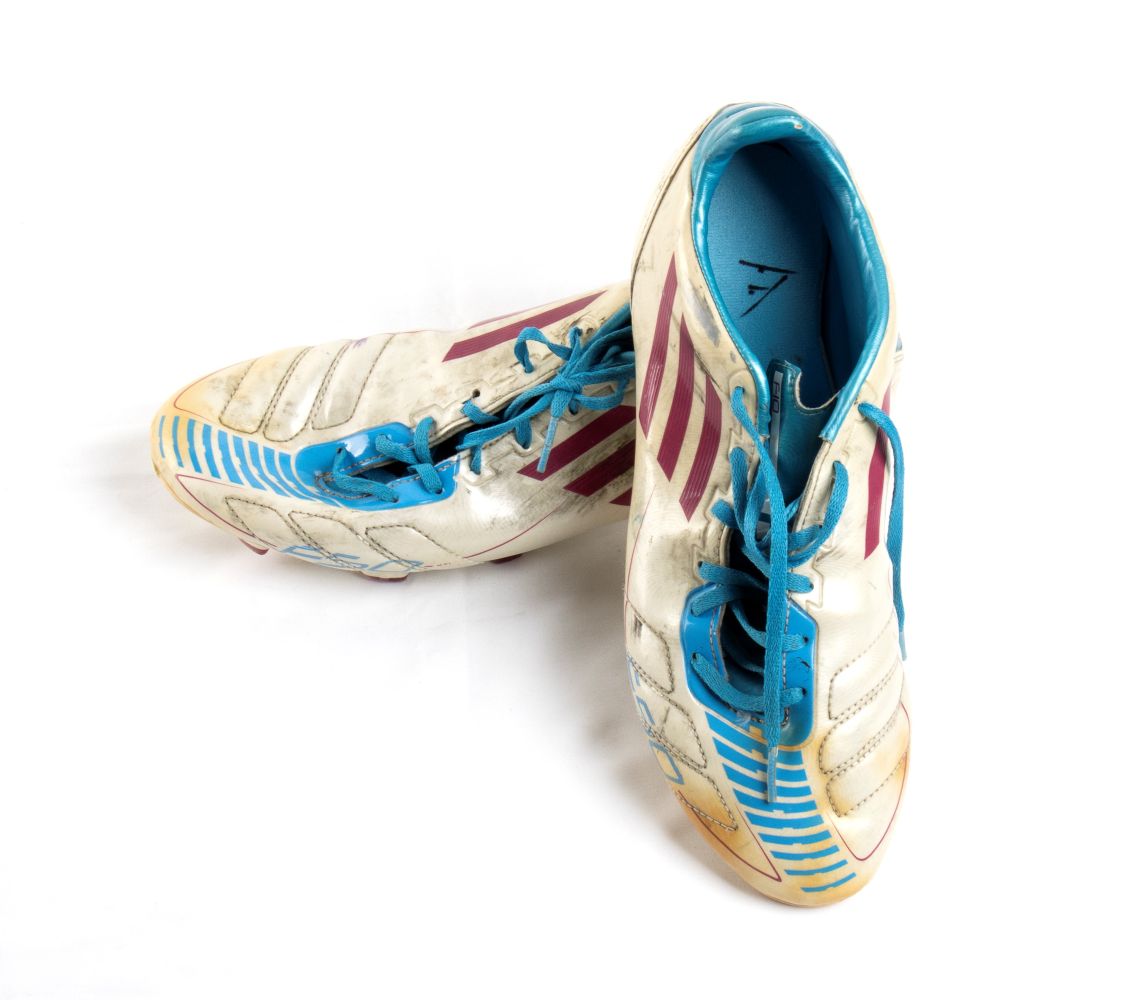 sintetico varie Stagione 2010/2011, ADIDAS, paio di scarpini di gara usati da Edinson Cavani nella partita Napoli-Lazio (4-3) del 3/4/2011. Taglia EU 42.5 - Scarpini ADIDAS, con segni di gioco. Presente certificato di autenticità