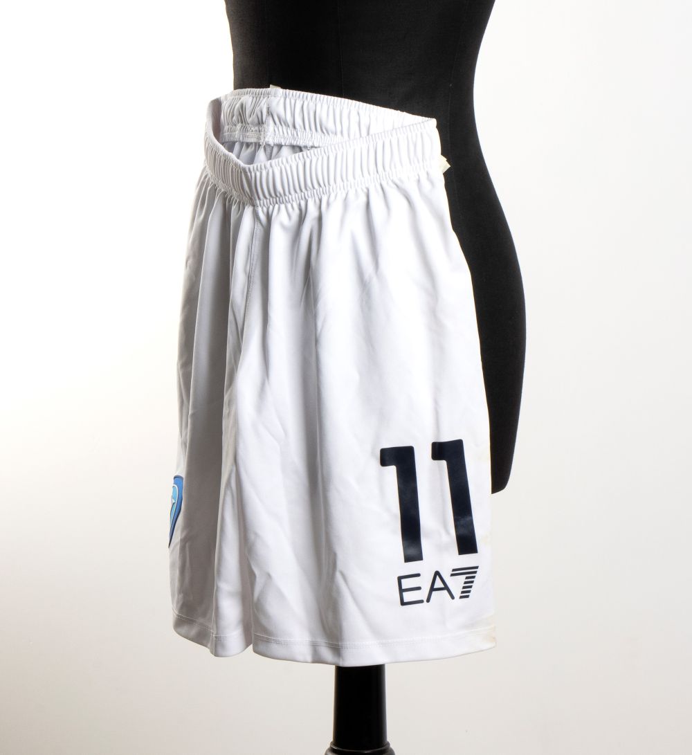 stoffa varie Stagione 2022/2023, pantaloncini da gara, usati da Hirving Lozano per la partita Napoli-Milan (0-4) del 3/4/2023. Pantaloncini bianchi, con numero 11 stampato, logo SSC NAPOLI "N" applicato, marchio EA7. Tracce di sporco, macchie verdi dell'erba del campo di gioco, non lavati. Fornito certificato di autenticità