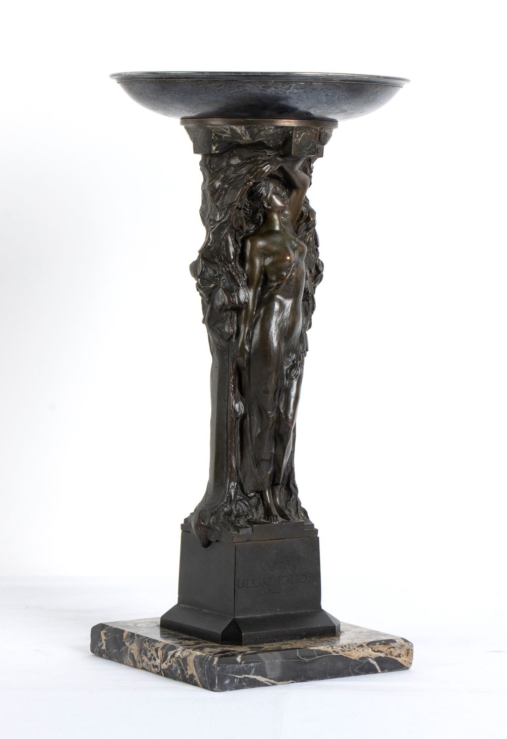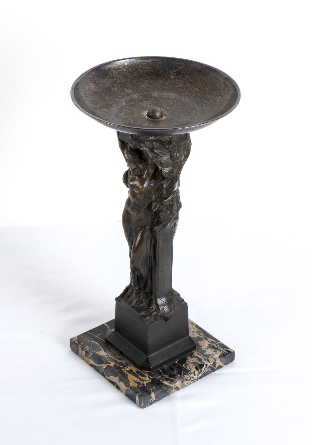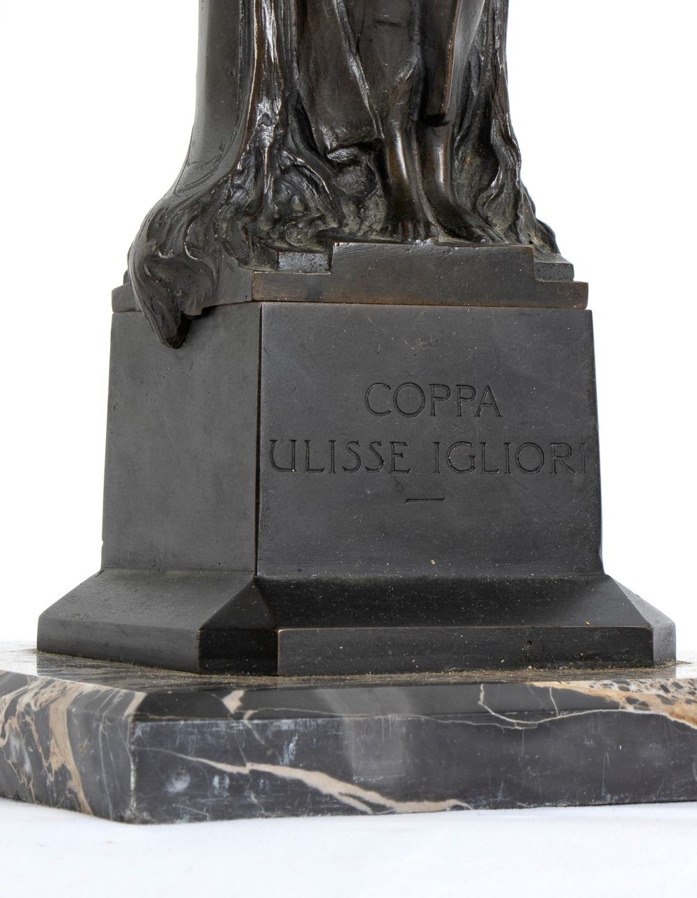 Trofeo in bronzo, denominato con incisione alla base COPPA ULISSE IGLIORI , periodo seconda metà anni '920, presumibilmente per qualche torneo che vedeva coinvolte squadre di calcio per club regionali del Lazio, come la AS ROMA e la SS LAZIO. Bella rappresentazione di due donne nelle vesti della vittoria a sorreggere la coppa applicata in cima alla scultura, poggiante su base in marmo. Ottime condizioni.