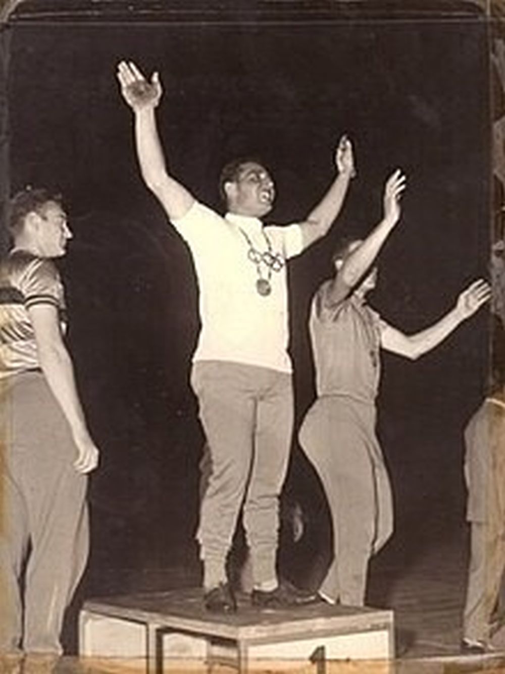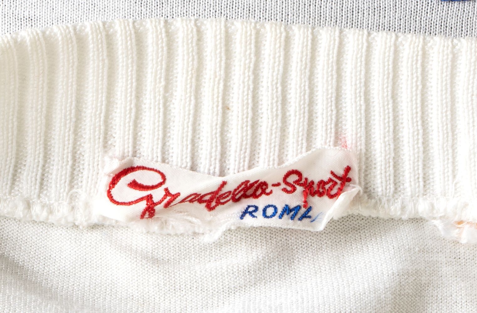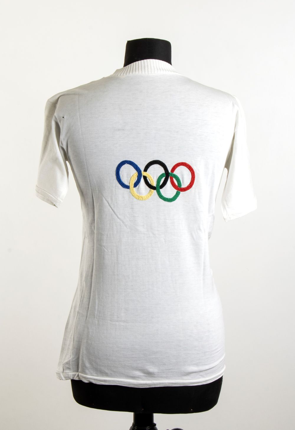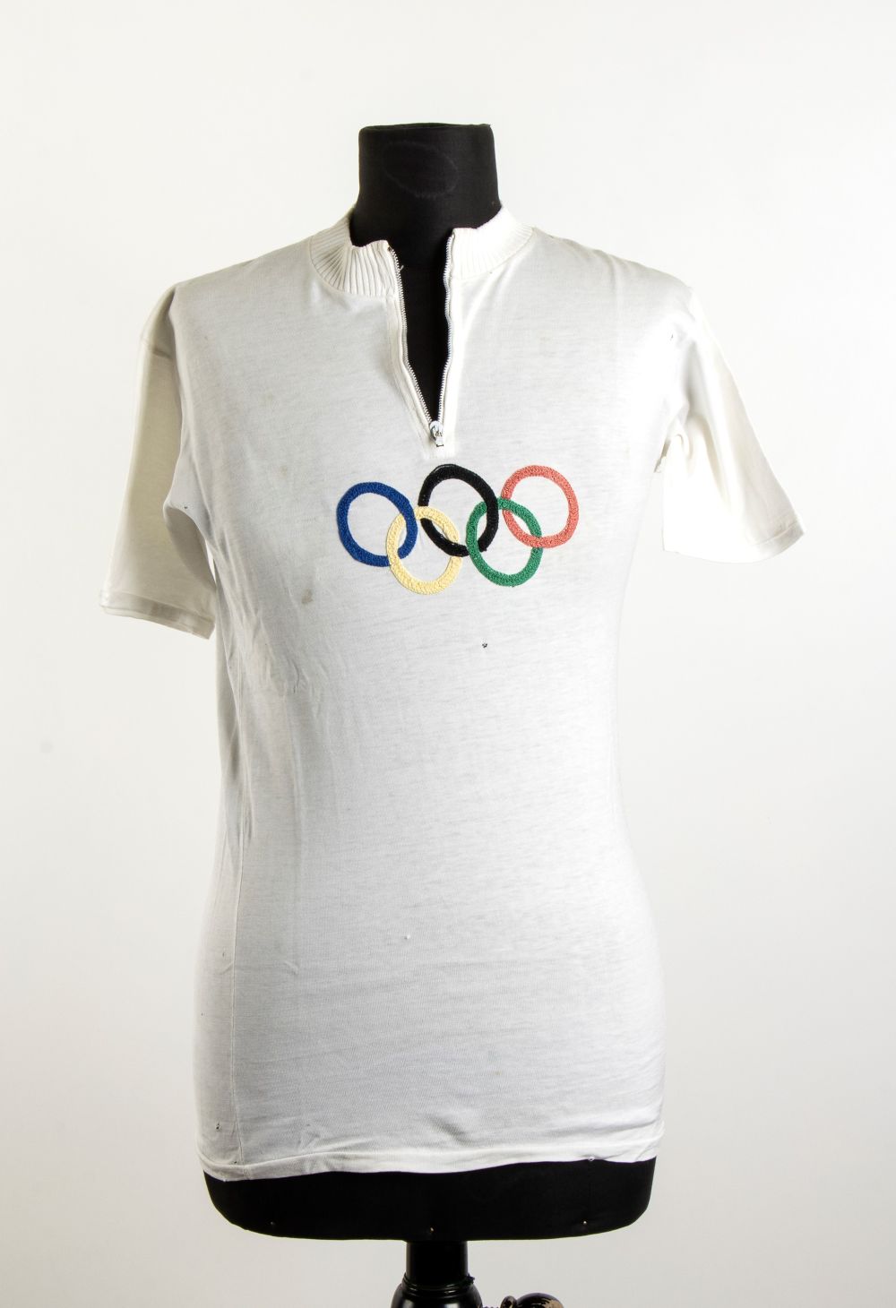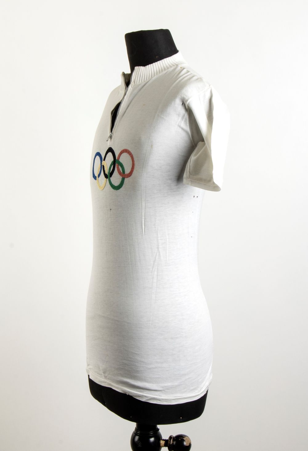 cotone Maglia bianca con simbolo olimpico dei cinque cerchi iridati appartenuta al campione Sante Gaiardoni, medaglia d'oro alle Olimpiadi di Roma del 1960. Maglia a maniche corte, cerchi ricamati, collo con chiusura a zip, etichetta Gradella-Roma cucita all'interno. Maglia in buone condizioni, qualche macchia sparsa e piccole tarmature. Provenienza ex-museo dello Sport di Torino