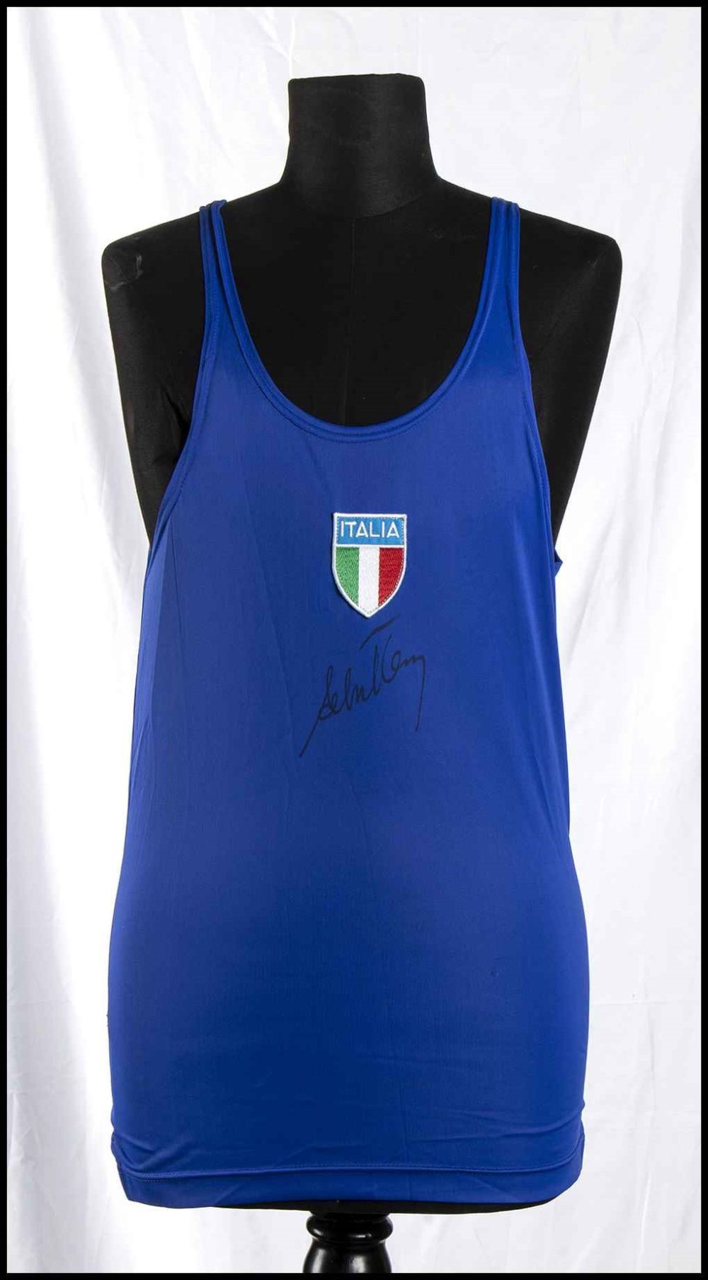 jersey Canottiera azzurra, atletica, di Alberto Cova. Sul fronte scudetto tricolore ITALIA ricamato ed applicato, autografo scritto di pugno da Alberto Cova, a pennarello nero indelebile. Provenienza ex Museo dello Sport di Torino