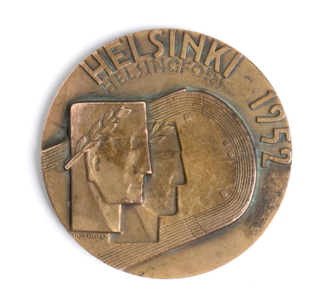 bronzo mm.54 Medaglia in bronzo di partecipazione per atleti ai giochi olimpici della XV OLYMPIA HELSINKI 1952 HELSINGFORS - Disegnata e firmata da Kauko Räsänen, realizzata da Veljekset Sundqvist Oy - Patina del tempo, nessun danno, condizioni molto buone