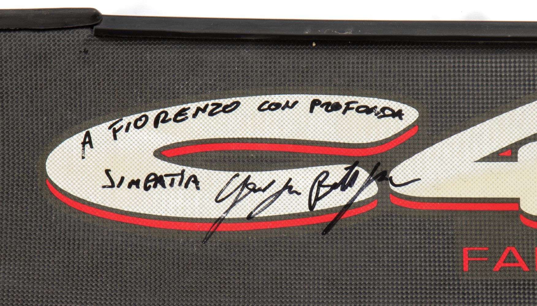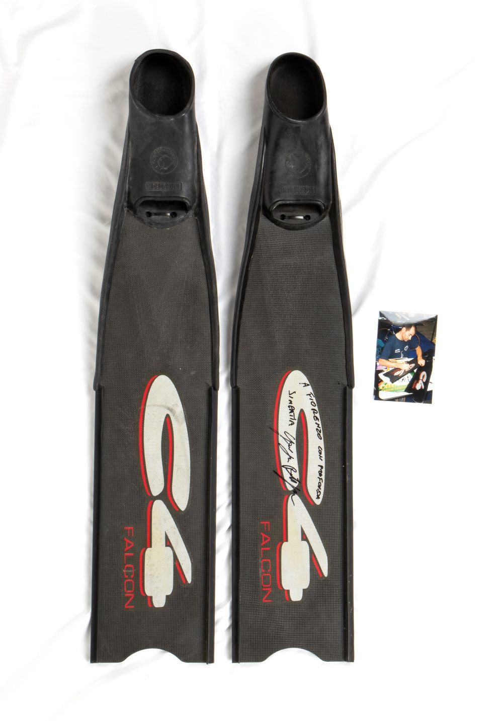 Pinne di profondità appartenute a Gaspare Battaglia, pluri campione del mondo di apnea, con dedica ed autografo originali scritti di pugno da Battaglia. Pinne modello FALCON C4, lunghezza circa cm.105 - In aggiunta fotografia che ritrae Battaglia intento ad autografare le pinne in oggetto. In buone condizioni