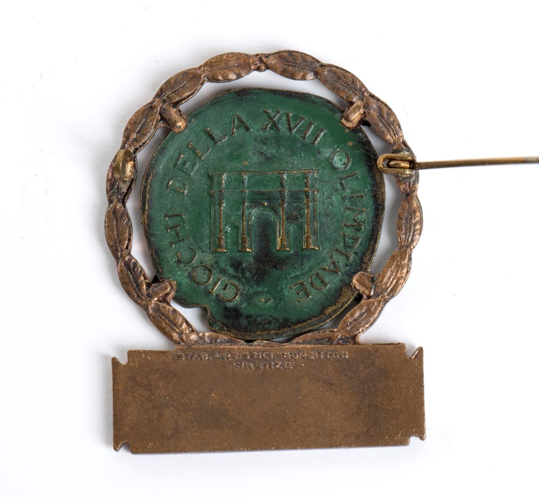 bronzo Raro distintivo / badge per INVITATI e MISSIONE GIAPPONESE alle Olimpiadi di Roma del 1960 - Medaglia centrale in bronzo patina verde con dicitura Giochi della XVII Olimpiade - Piastrina inferiore in bronzo smaltata guillochè arancio, marcata Stabilimenti Artistici Fiorentini . In perfette condizioni