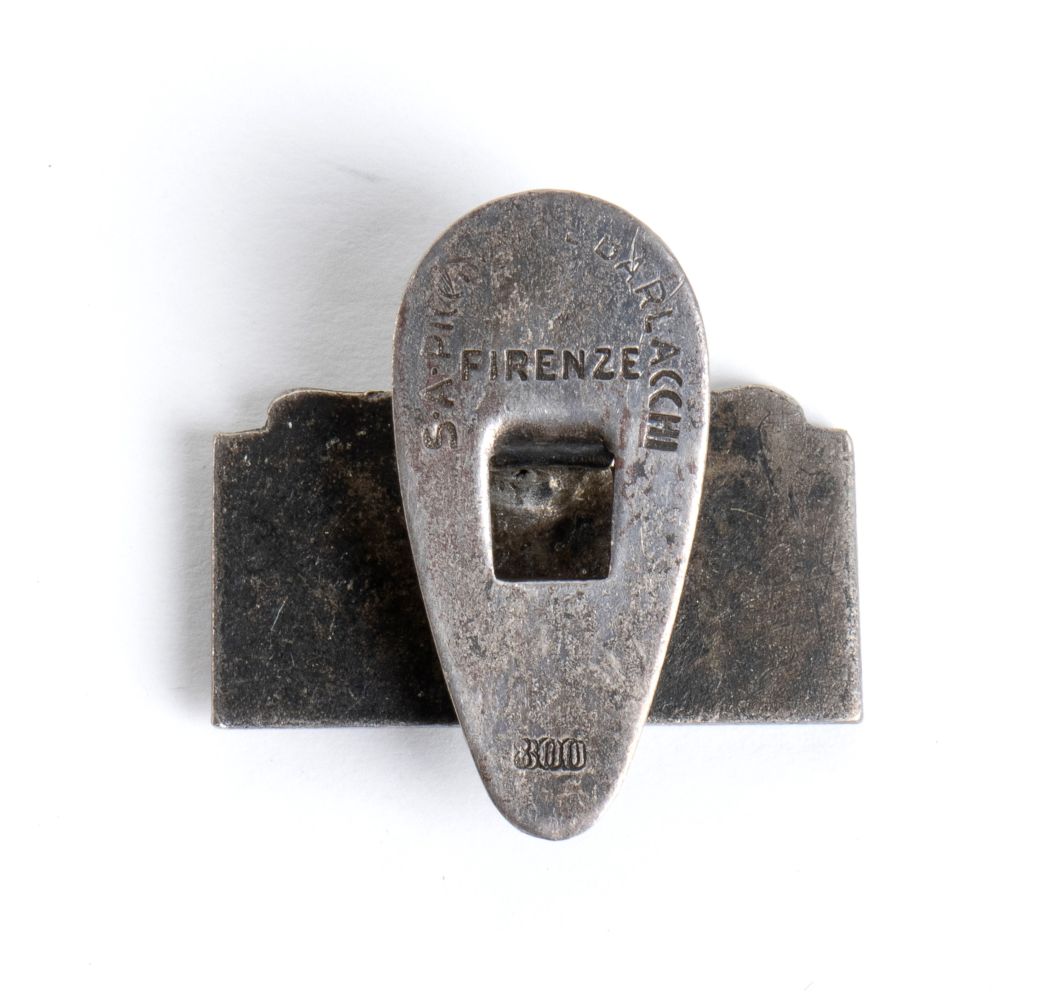 metallo Distintivo a piedino in argento marcato 800 e smaltato, con fascio littorio al centro su sfondo tricolore italiano, corona reale e nodi savoia. Per funzionario o dirigente del CONI o atleta nazionale italiana, marcato S.A.PICCHIANI E BARLACCHI. In ottime condizioni