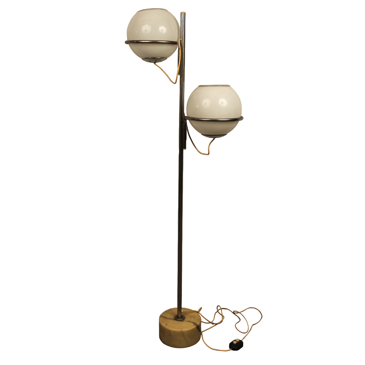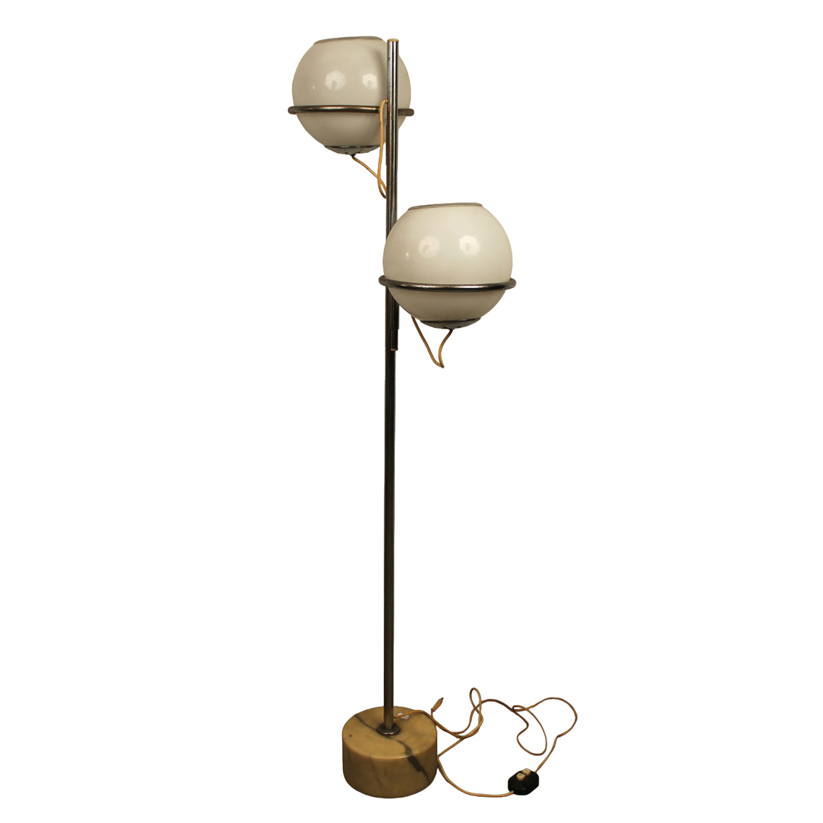 Two-light floor lamp in chromed metal, glass spheres and marble foot. H 165 cm