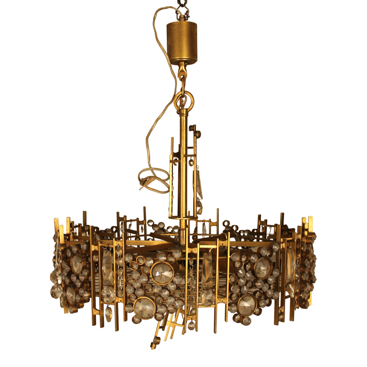 Ottone dorato e vetro. Seconda metà del secolo XX. Design attribuito a Gaetano Sciolari. Cm h 60; cm d 50