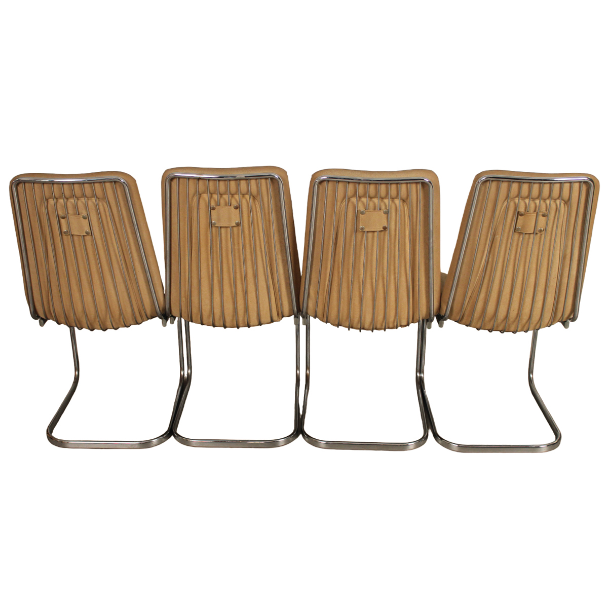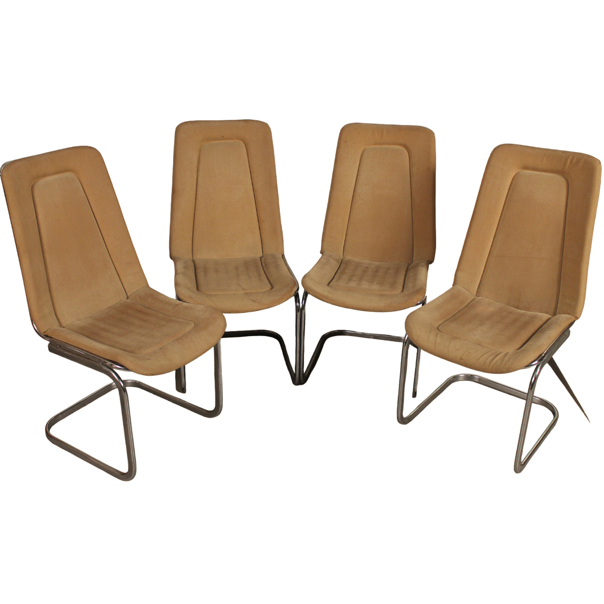 Acciaio con piano in velluto. Sedie in tessuto e acciaio. Cm 100x100 h 71 (tavolo); cm 45x50 h 95 (sedie)