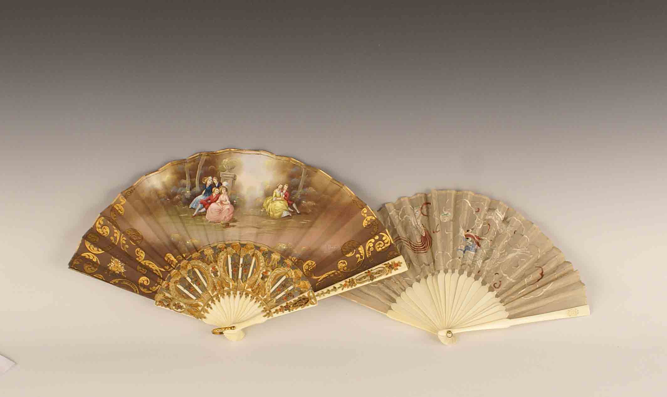 Lotto composto da due ventagli in avorio di cui uno dipinto a raffigurare una scena galante e l'altro ricamato a motivi orientali.