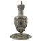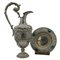 Argento finemente inciso e sbalzato a motivi vegetali e ornamentali con mascheroni a rilievo e placche in malachite. Secolo XX. Incisione sul piede "Gioielleria Monti Decio Bergamo". Peso complessivo gr. 7,200. Cm h 72 (brocca); cm d 39