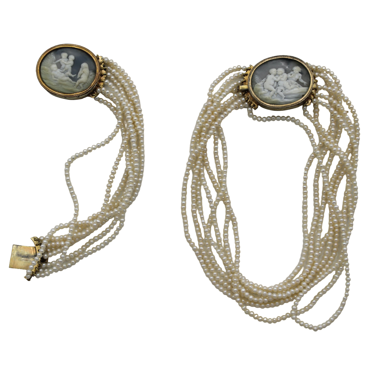 Freshwater pearls and cameos depicting cherubs. Early 1900s