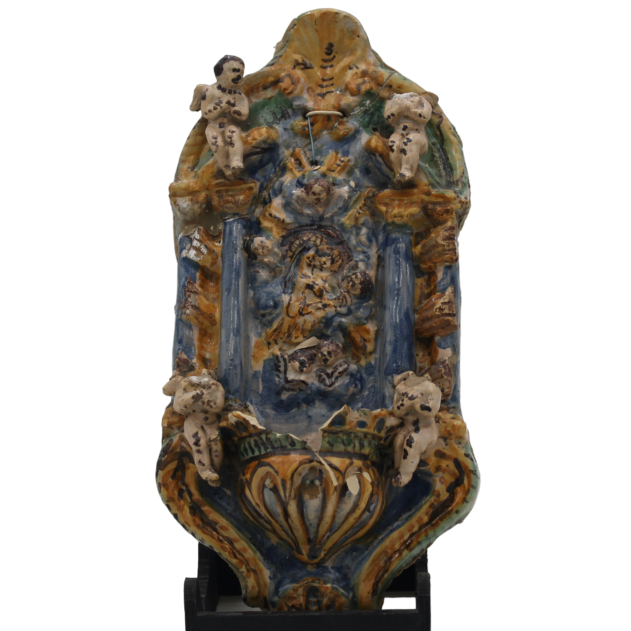 Antica maiolica policroma decorata con putti alati e motivi ornamentali (rotture e mancanze). Ariano Irpino. Secolo XVIII. Cm 35x17