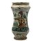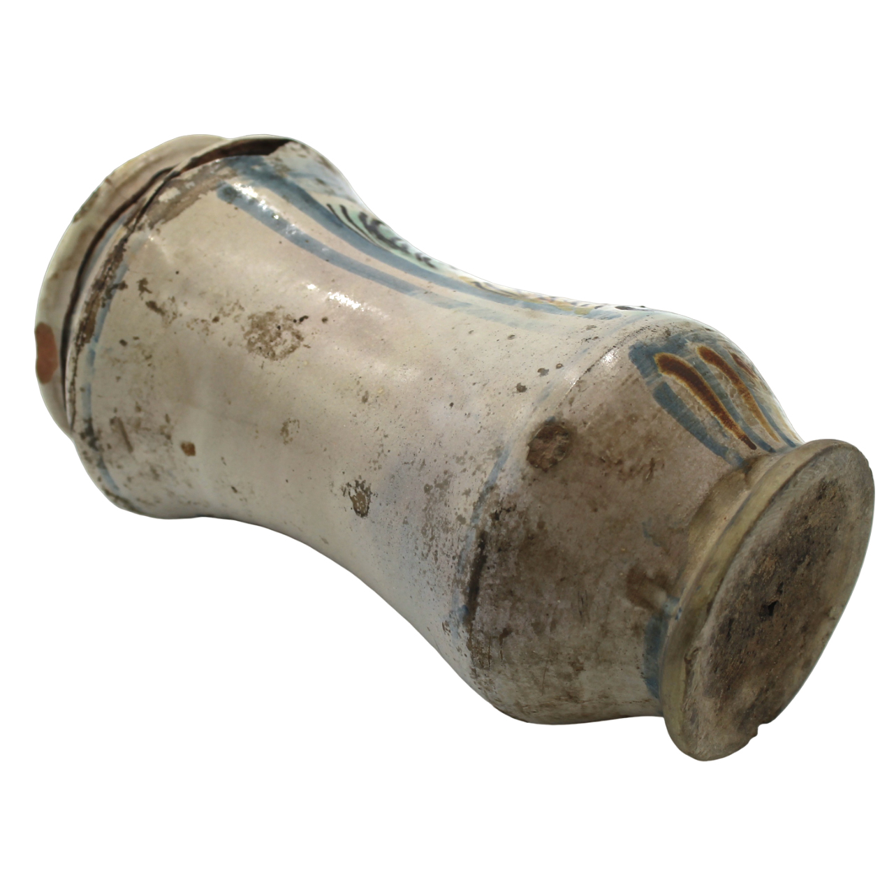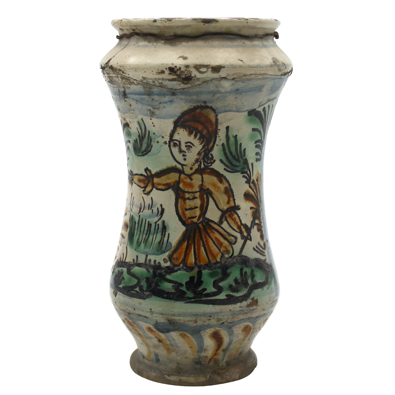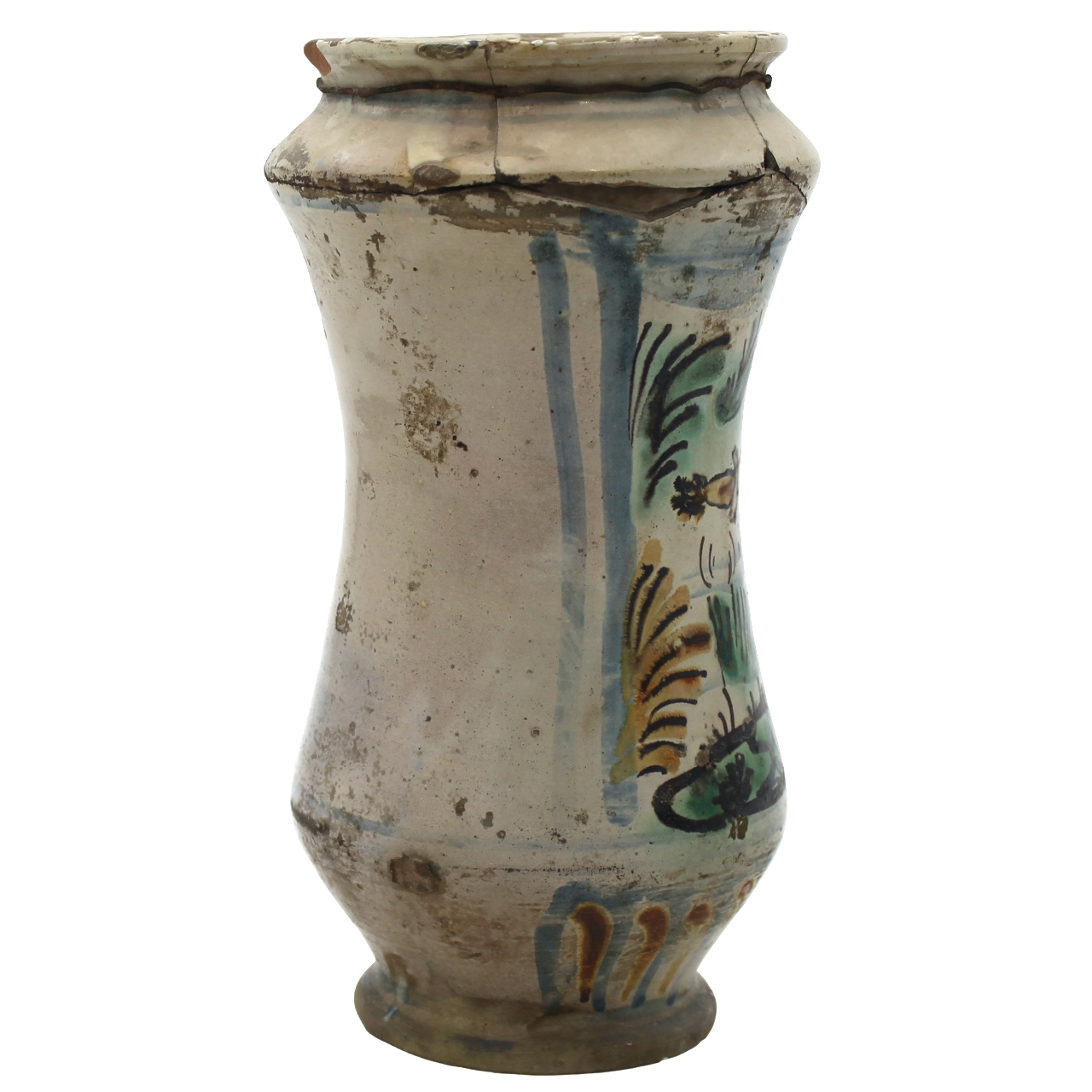 Ancient majolica decorated with the figure of a child on the front and polychrome ornamental motifs (various breakages and missing parts). Naples. 19th century. 24 cm high
