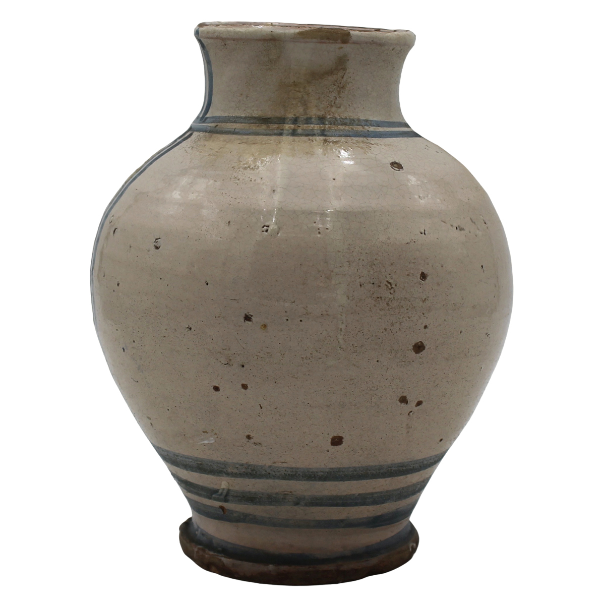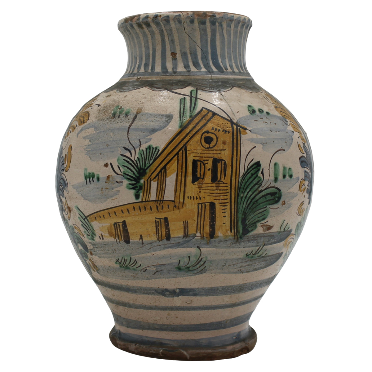 Ancient majolica decorated in the center with a landscape with polychrome farmhouses on a cream background (feliure on the neck). Southern Italy. Beginning of the 19th century. H28cm