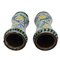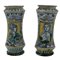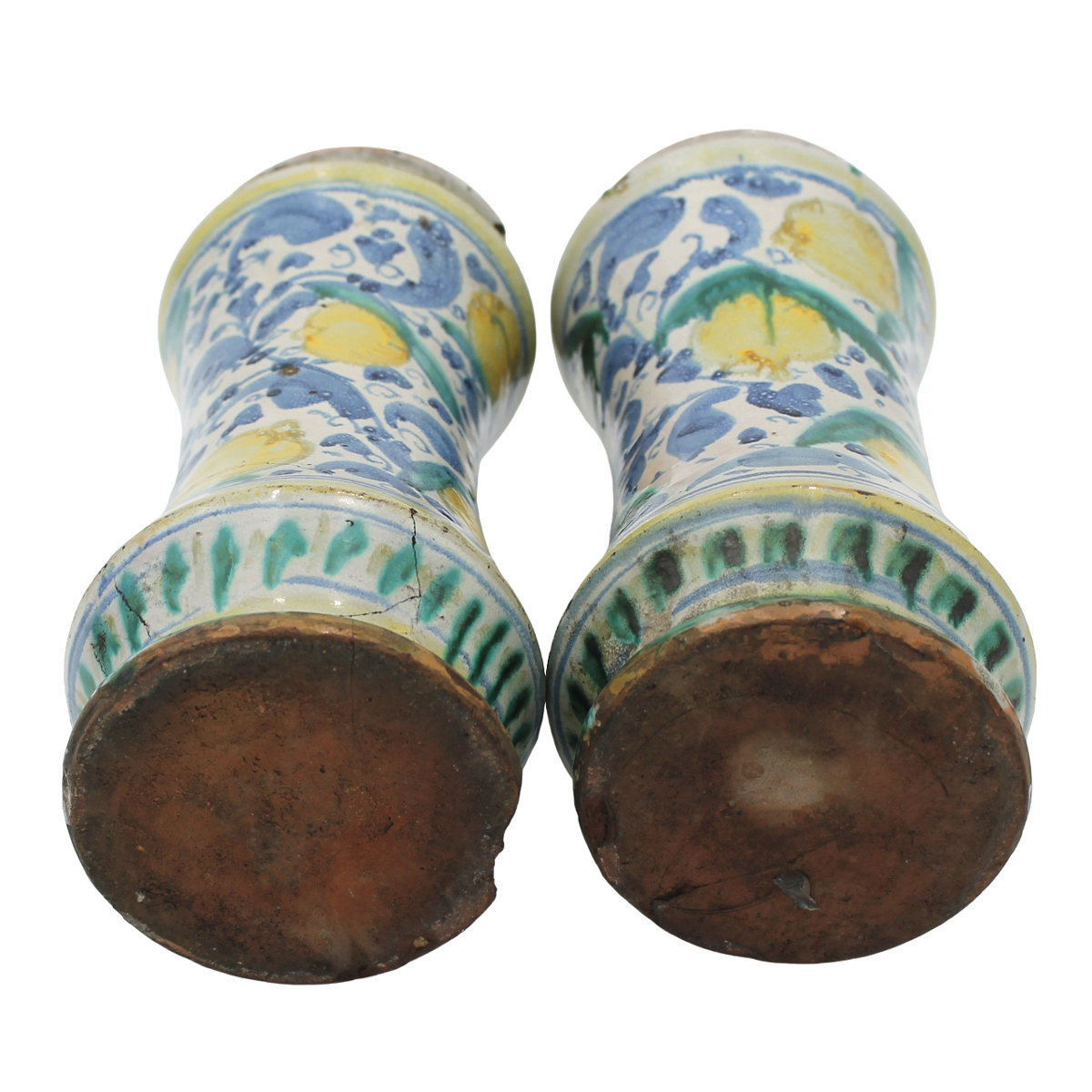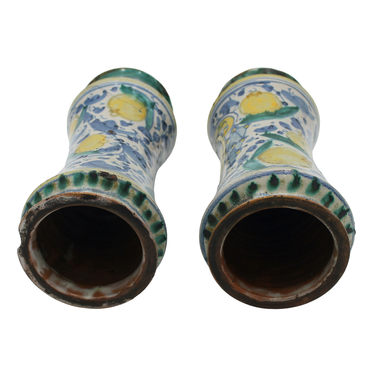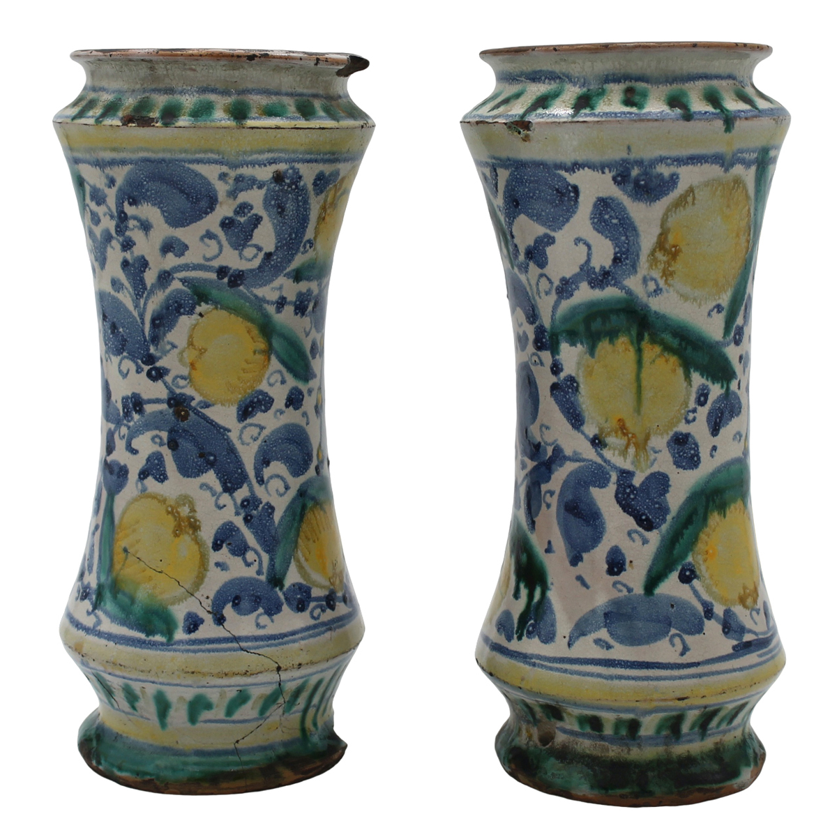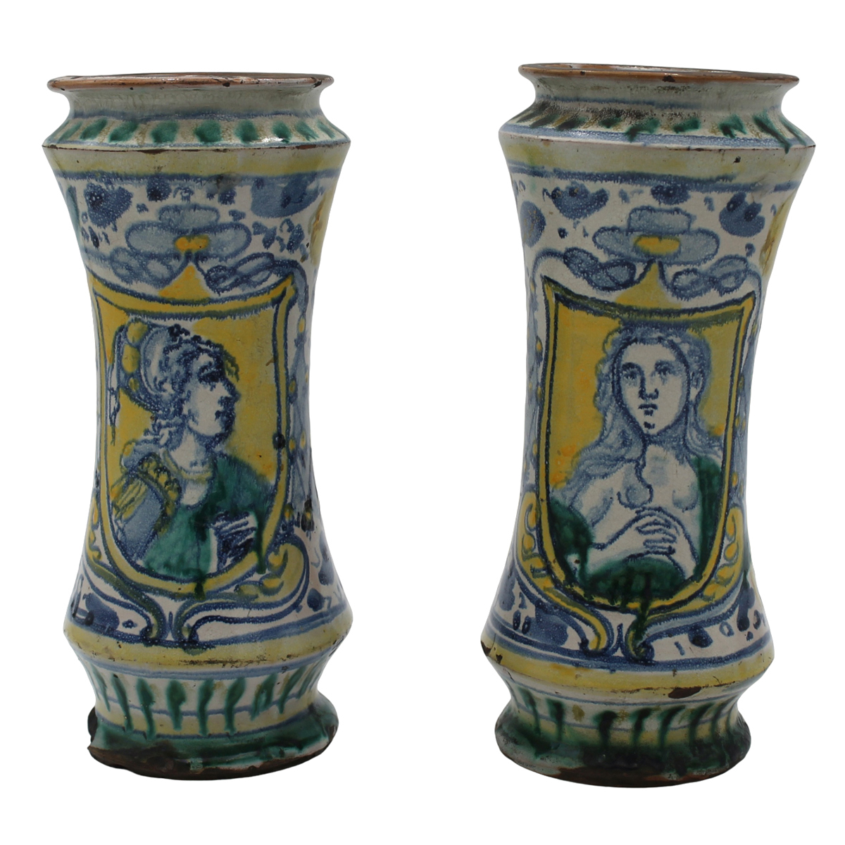 Ancient majolica decorated in the center with shield-shaped medallions with the figure of a praying woman and profile of a woman with a hat inside (feliure on the foot of one of the two). Plant ornaments in light blue and lemons on the back. Sciacca. 17th century. Cm H 28
