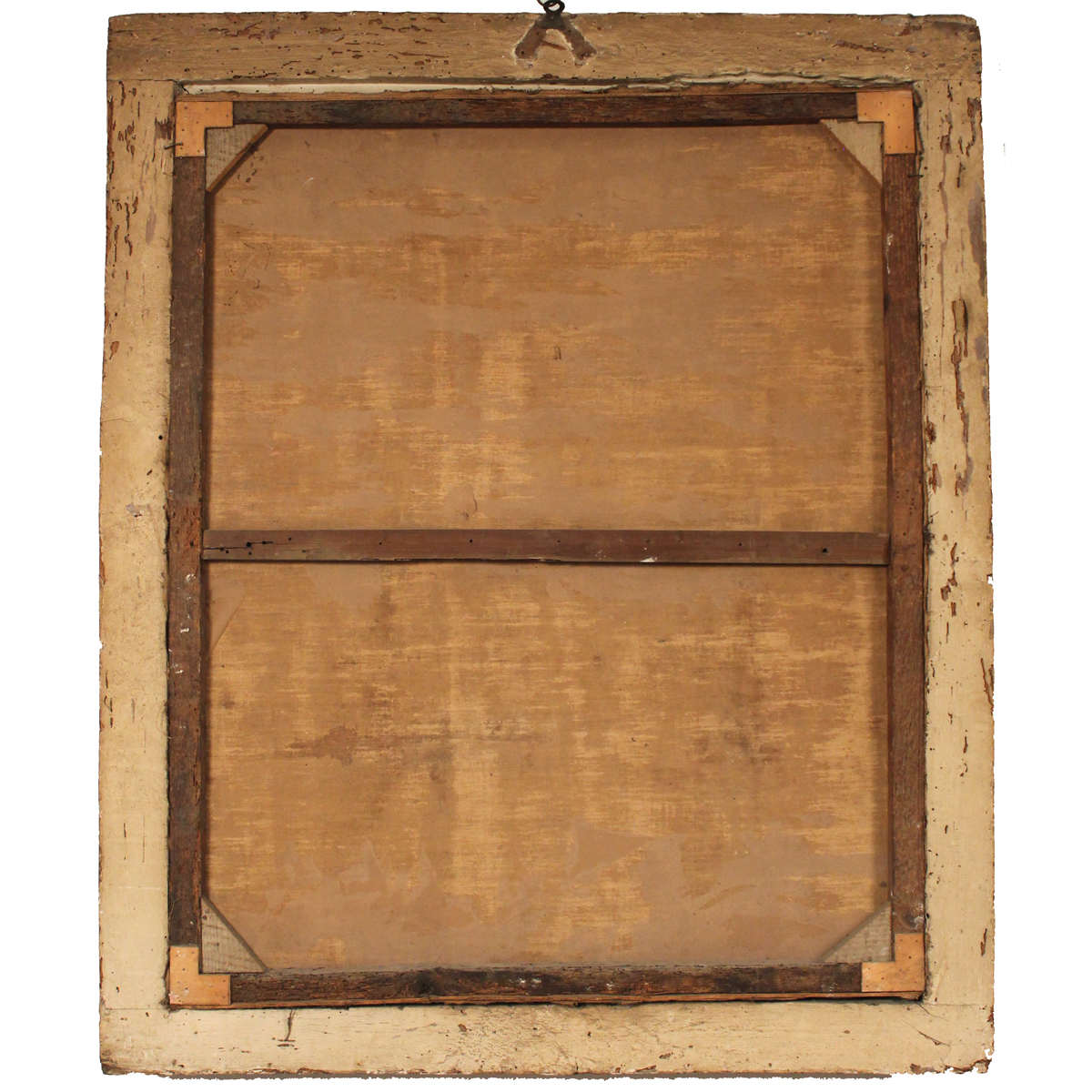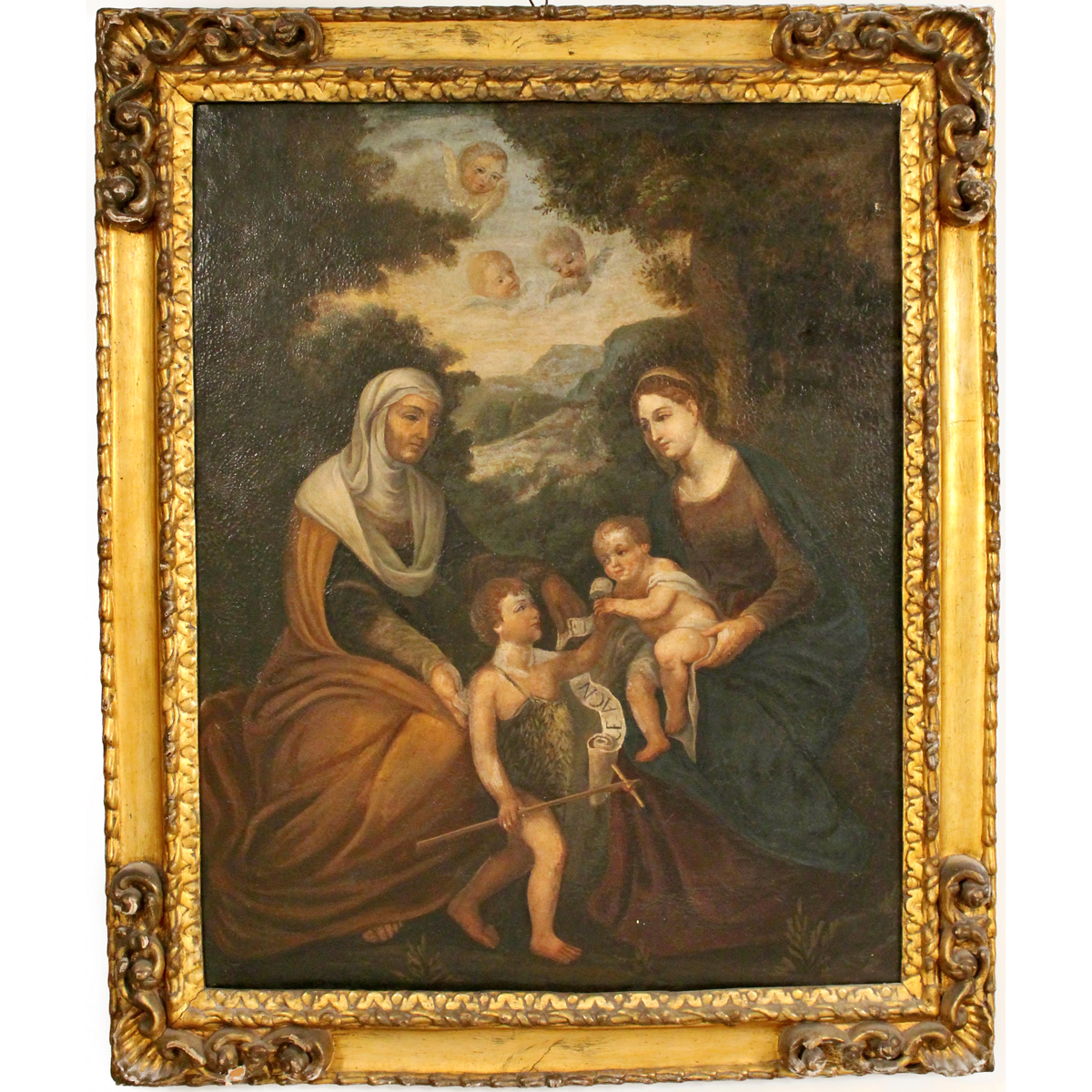 Dipinto ad olio su tela in cornice in legno dorato e scolpito a motivi ornamentali e vegetali (restauri). Cm123x101