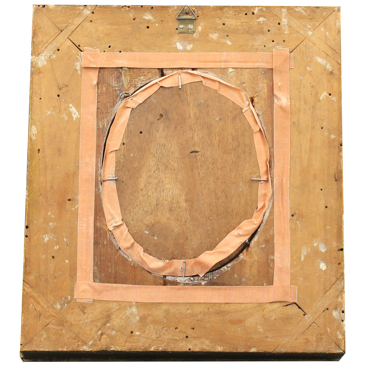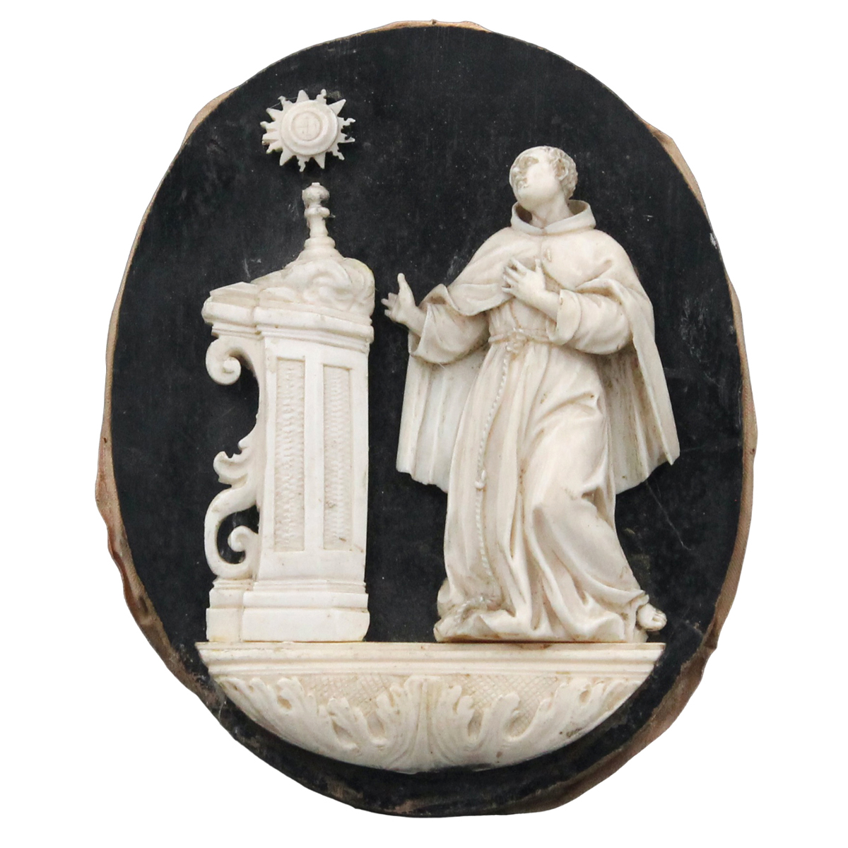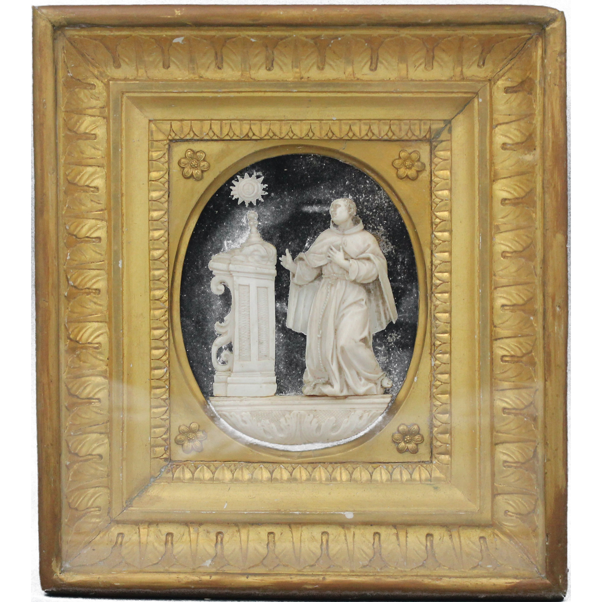 Sculpture in ancient ivory masterfully carved in a carved and gilded wooden case (slight defects on the fingers of the right hand, case from a later period). It operates with CITES certification. 16x13 cm (statue); 29x25 cm