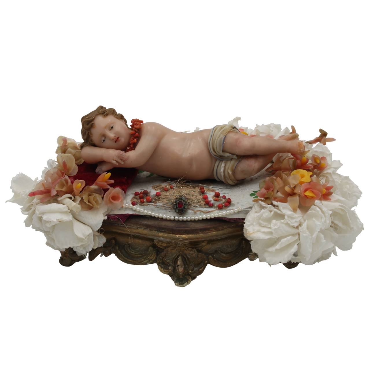 Cera policroma con applicazioni di corallo e base in legno dorato (piccoli restauri). Sicilia. Secolo XIX. Cm 22