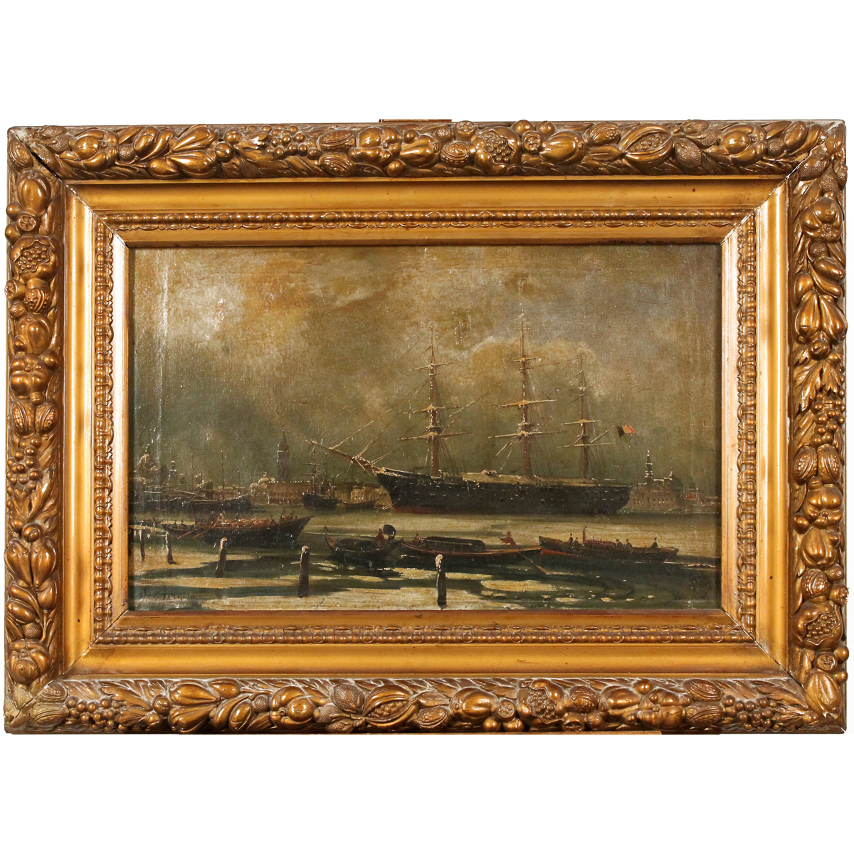 Dipinto ad olio su tela in cornice in legno dorato (danni alla tela). Cm 37x60