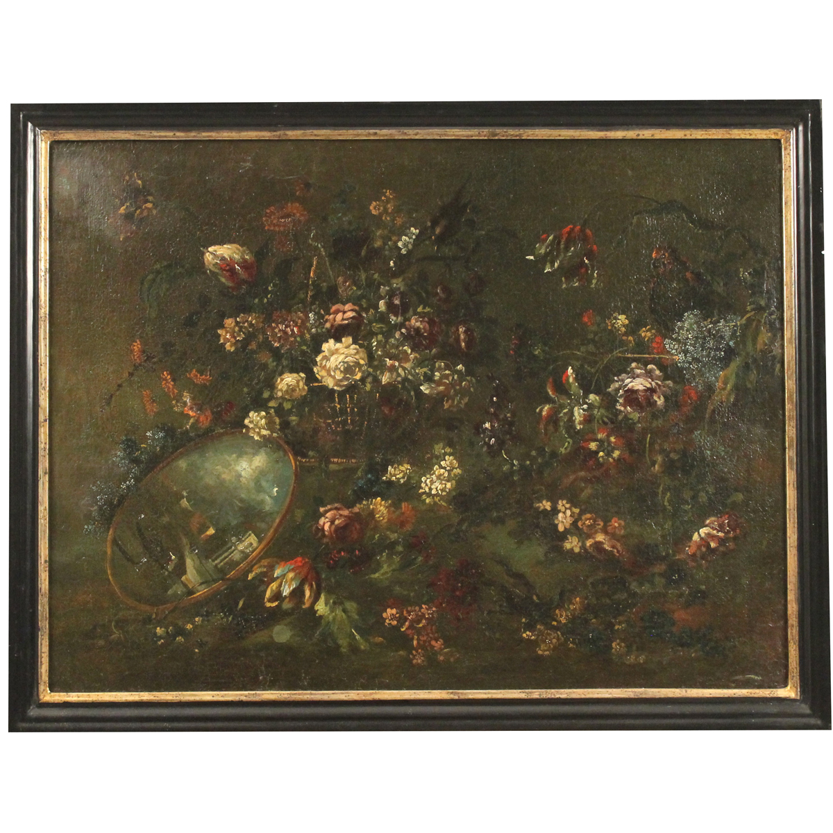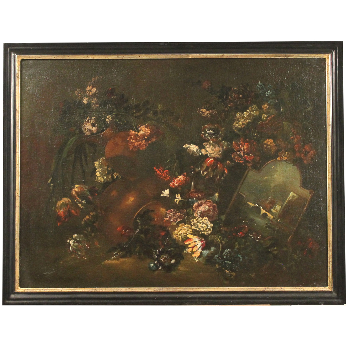 Coppia di dipinti ad olio su tela in cornici in legno ebanizzato (rifoderato e restauri). Cm 60x80