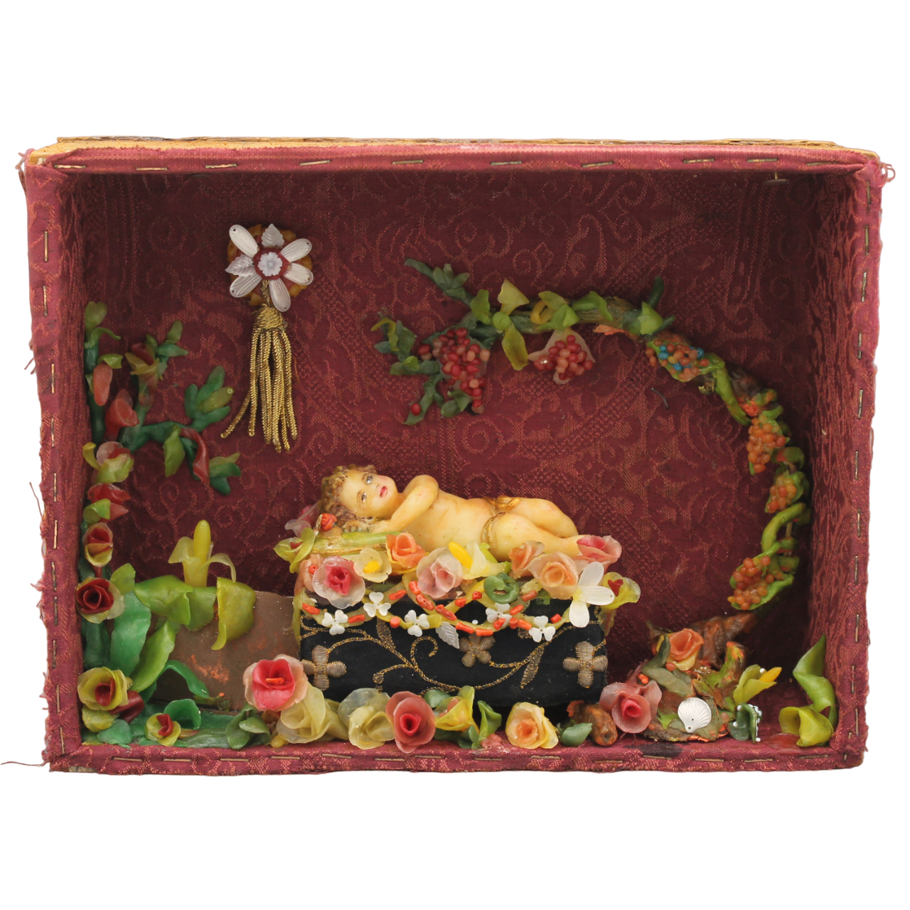 Polychrome wax in wooden case. Sicily. 19th century. 12 cm (child); 27x33.5x11 cm (display case)