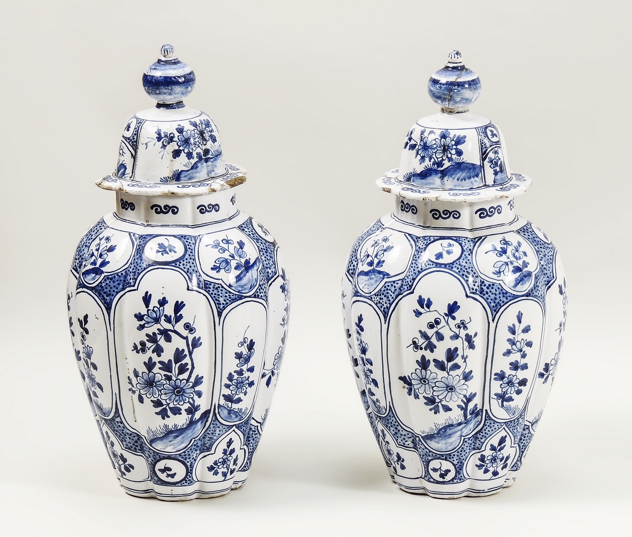 COPPIA DI VASI IN MAIOLICA - PAIR OF MAJOLICA JARS Delft, prima metà del XX secolo - first half of 19th Century dipinti in monocromia blu con mitivi floreali, difetti e restauri h cm 41