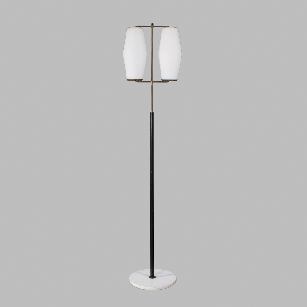 lampada da terra in metallo verniciato, ottone e vetro opalino, base in marmo bianco, etichetta della produzione, usure