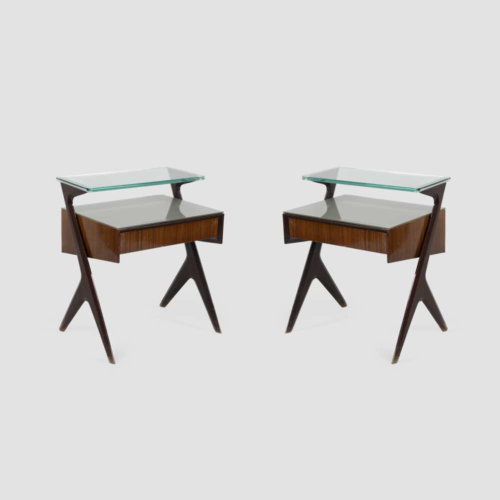coppia di comodini in legno, vetro retroverniciato e vetro trasparente