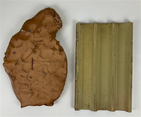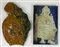 Lotto composto da una piastrella in terracotta smaltata raffigurante una figura assisa su fondo blu e una formella in terracotta smaltata nei toni del marrone e del nero raffigurante figura antropomorfa grafta con fiore, firma non decifrata al verso. Secolo XX. (misure diverse) (lievi difetti)