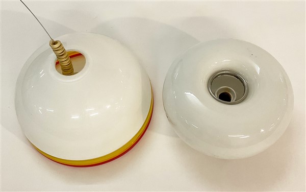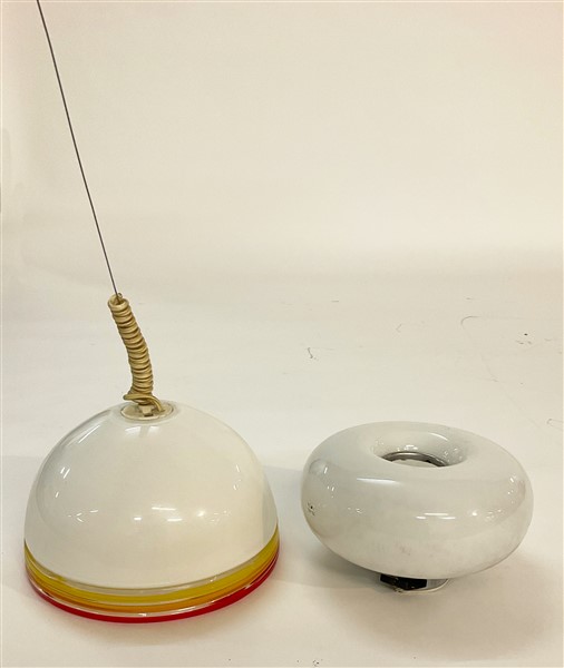 Lotto di due lampade a sospensione con diffusori in vetro marcate Leucos (d cm 31) e Lamperti (d cm 27). Italia, anni '70/'80. (lievi difetti)